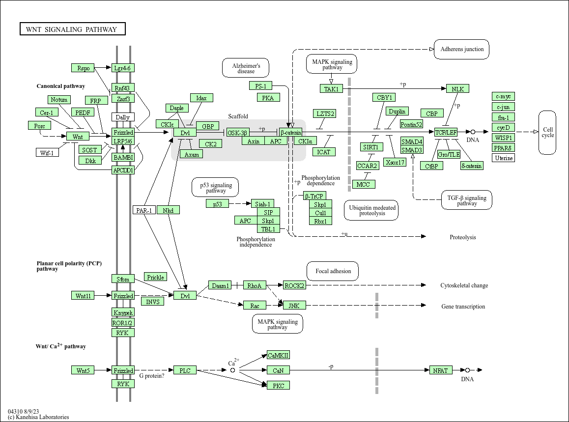 Wnt proteins are secreted morphogens that are required for basic developmental processes, such as cell-fate specification, progenitor-cell proliferation and the control of asymmetric cell division, in many different species and organs. There are at least three different Wnt pathways: the canonical pathway, the planar cell polarity (PCP) pathway and the Wnt/Ca2+ pathway. In the canonical Wnt pathway, the major effect of Wnt ligand binding to its receptor is the stabilization of cytoplasmic beta-catenin through inhibition of the bea-catenin degradation complex. Beta-catenin is then free to enter the nucleus and activate Wnt-regulated genes through its interaction with TCF (T-cell factor) family transcription factors and concomitant recruitment of coactivators. Planar cell polarity (PCP) signaling leads to the activation of the small GTPases RHOA (RAS homologue gene-family member A) and RAC1, which activate the stress kinase JNK (Jun N-terminal kinase) and ROCK (RHO-associated coiled-coil-containing protein kinase 1) and leads to remodelling of the cytoskeleton and changes in cell adhesion and motility. WNT-Ca2+ signalling is mediated through G proteins and phospholipases and leads to transient increases in cytoplasmic free calcium that subsequently activate the kinase PKC (protein kinase C) and CAMKII (calcium calmodulin mediated kinase II) and the phosphatase calcineurin.