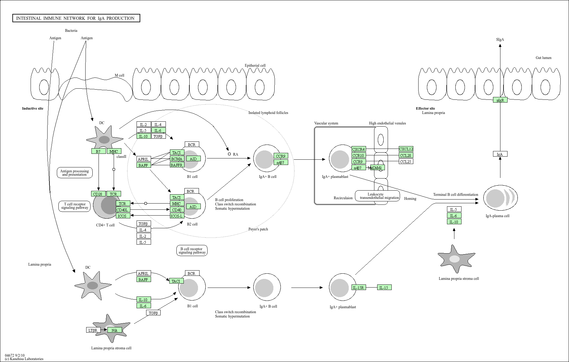 The intestine is the largest lymphoid tissue in the body. One striking feature of intestinal immunity is its ability to generate great amounts of noninflammatory immunoglobulin A (IgA) antibodies that serve as the first line of defense against microorganisms. The basic map of IgA production includes induction of mucosal B cells in the Peyer's patches, circulation through the bloodstream and homing to intestinal mucosa of IgA-commited plasma cells, and local antibody production for export across the intestinal membranes. Multiple cytokines, including TGF-{beta}, IL-10, IL-4, IL-5, and IL-6, are required to promote IgA class switching and terminal differentiation process of the B cells. Secreted IgA promotes immune exclusion by entrapping dietary antigens and microorganisms in the mucus and functions for neutralization of toxins and pathogenic microbes.