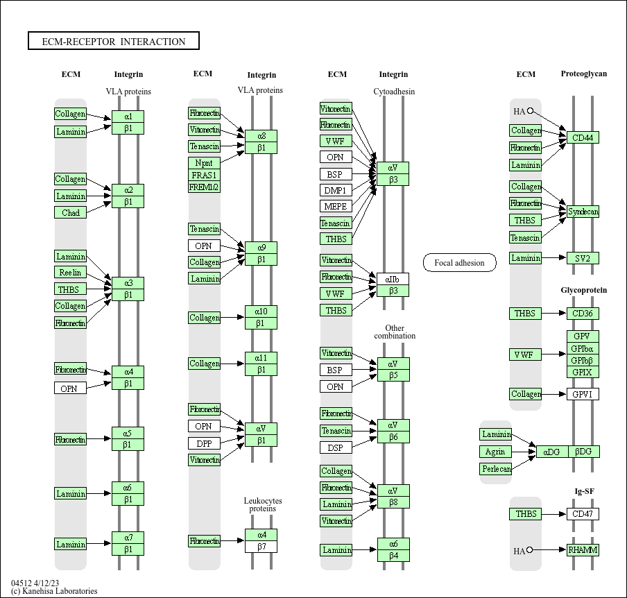 The extracellular matrix (ECM) consists of a complex mixture of structural and functional macromolecules and serves an important role in tissue and organ morphogenesis and in the maintenance of cell and tissue structure and function. Specific interactions between cells and the ECM are mediated by transmembrane molecules, mainly integrins and perhaps also proteoglycans, CD36, or other cell-surface-associated components. These interactions lead to a direct or indirect control of cellular activities such as adhesion, migration, differentiation, proliferation, and apoptosis. In addition, integrins function as mechanoreceptors and provide a force-transmitting physical link between the ECM and the cytoskeleton. Integrins are a family of glycosylated, heterodimeric transmembrane adhesion receptors that consist of noncovalently bound alpha- and beta-subunits.