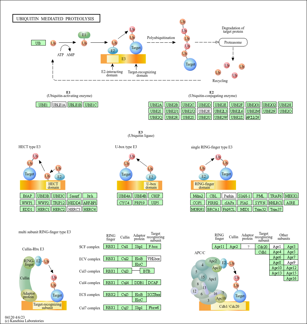 Protein ubiquitination plays an important role in eukaryotic cellular processes. It mainly functions as a signal for 26S proteasome dependent protein degradation. The addition of ubiquitin to proteins being degraded is performed by a reaction cascade consisting of three enzymes, named E1 (ubiquitin activating enzyme), E2 (ubiquitin conjugating enzyme), and E3 (ubiquitin ligase). Each E3 has specificity to its substrate, or proteins to be targeted by ubiquitination. Many E3s are discovered in eukaryotes and they are classified into four types: HECT type, U-box type, single RING-finger type, and multi-subunit RING-finger type. Multi-subunit RING-finger E3s are exemplified by cullin-Rbx E3s and APC/C. They consist of a RING-finger-containing subunit (RBX1 or RBX2) that functions to bind E2s, a scaffold-like cullin molecule, adaptor proteins, and a target recognizing subunit that binds substrates.