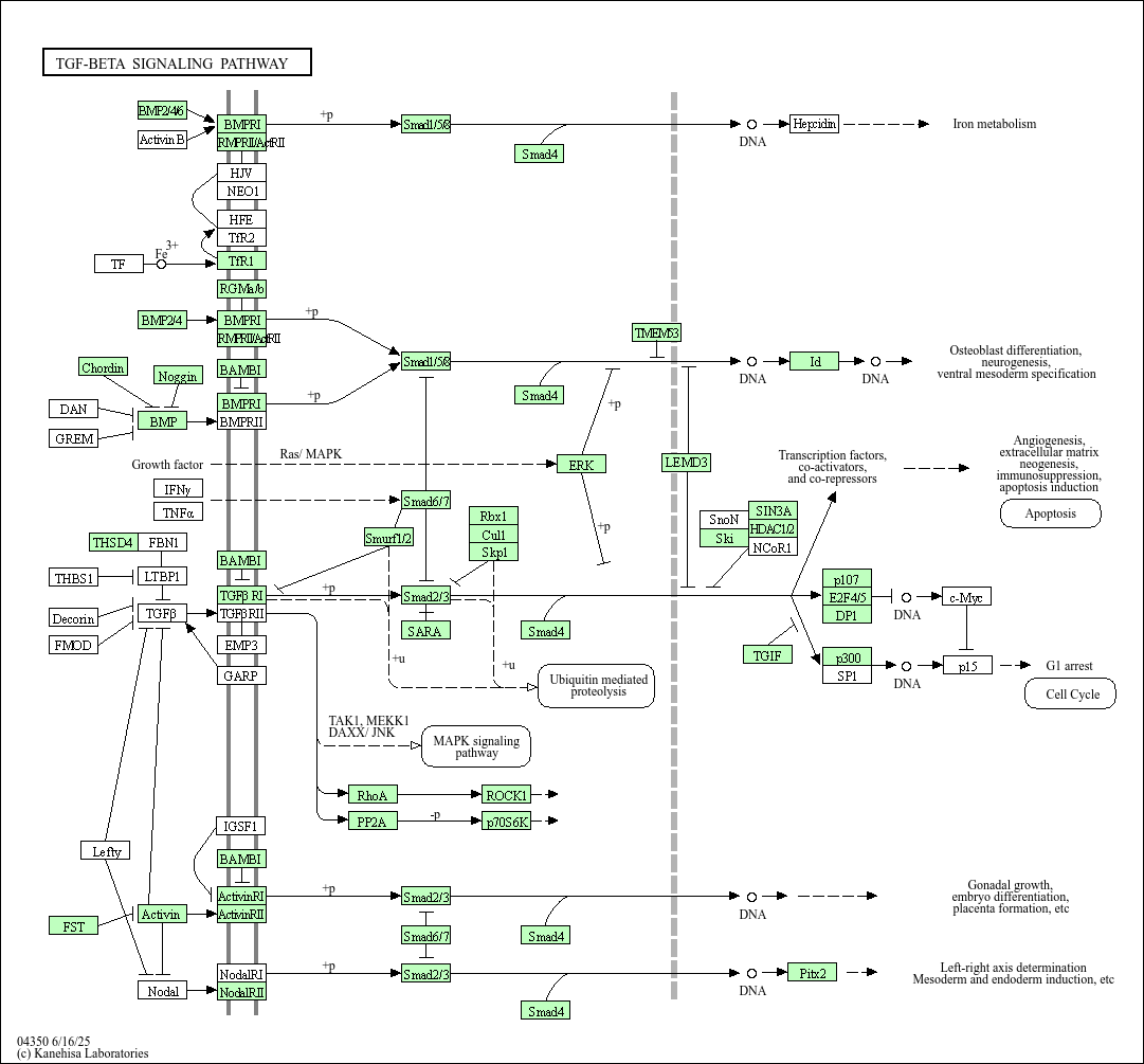 The transforming growth factor-beta (TGF-beta) family members, which include TGF-betas, activins and bone morphogenetic proteins (BMPs), are structurally related secreted cytokines found in species ranging from worms and insects to mammals. A wide spectrum of cellular functions such as proliferation, apoptosis, differentiation and migration are regulated by TGF-beta family members. TGF-beta family member binds to the Type II receptor and recruits Type I, whereby Type II receptor phosphorylates and activates Type I. The Type I receptor, in turn, phosphorylates receptor-activated Smads ( R-Smads: Smad1, Smad2, Smad3, Smad5, and Smad8). Once phosphorylated, R-Smads associate with the co-mediator Smad, Smad4, and the heteromeric complex then translocates into the nucleus. In the nucleus, Smad complexes activate specific genes through cooperative interactions with other DNA-binding and coactivator (or co-repressor) proteins.