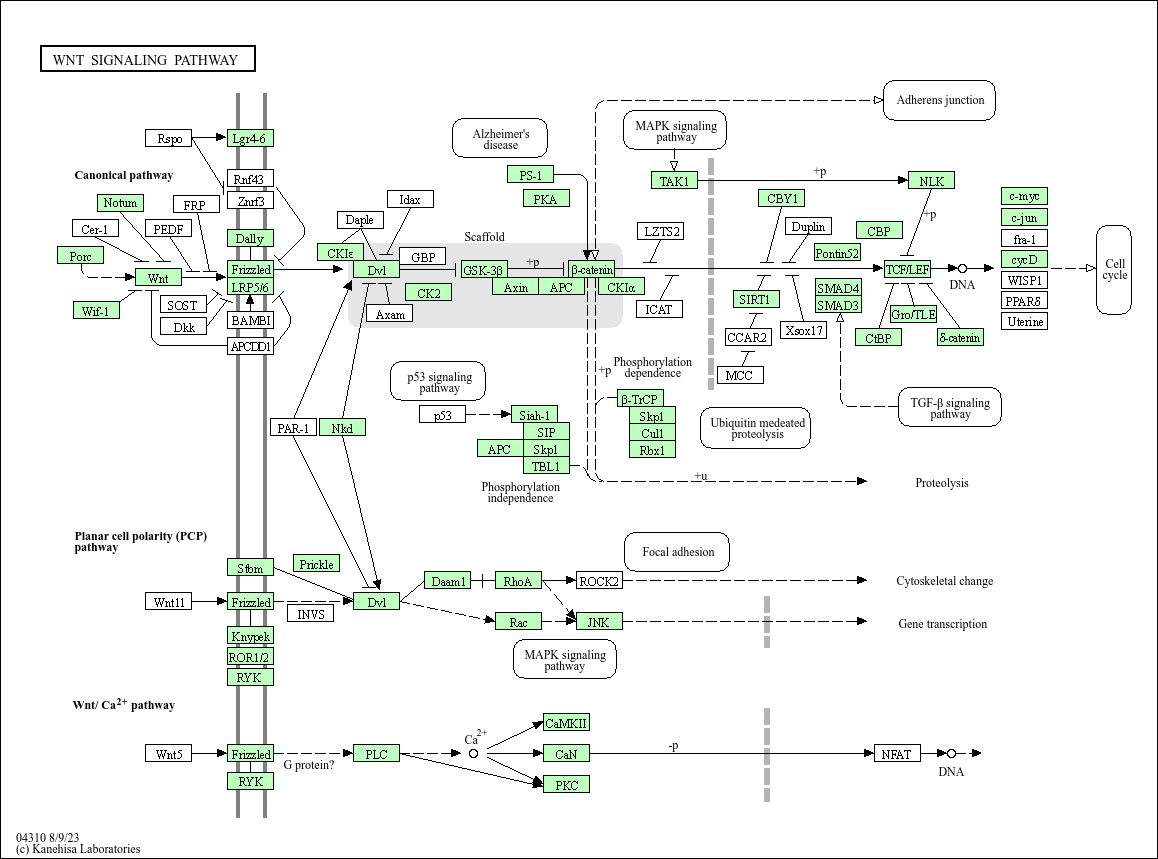 Wnt proteins are secreted morphogens that are required for basic developmental processes, such as cell-fate specification, progenitor-cell proliferation and the control of asymmetric cell division, in many different species and organs. There are at least three different Wnt pathways: the canonical pathway, the planar cell polarity (PCP) pathway and the Wnt/Ca2+ pathway. In the canonical Wnt pathway, the major effect of Wnt ligand binding to its receptor is the stabilization of cytoplasmic beta-catenin through inhibition of the bea-catenin degradation complex. Beta-catenin is then free to enter the nucleus and activate Wnt-regulated genes through its interaction with TCF (T-cell factor) family transcription factors and concomitant recruitment of coactivators. Planar cell polarity (PCP) signaling leads to the activation of the small GTPases RHOA (RAS homologue gene-family member A) and RAC1, which activate the stress kinase JNK (Jun N-terminal kinase) and ROCK (RHO-associated coiled-coil-containing protein kinase 1) and leads to remodelling of the cytoskeleton and changes in cell adhesion and motility. WNT-Ca2+ signalling is mediated through G proteins and phospholipases and leads to transient increases in cytoplasmic free calcium that subsequently activate the kinase PKC (protein kinase C) and CAMKII (calcium calmodulin mediated kinase II) and the phosphatase calcineurin.