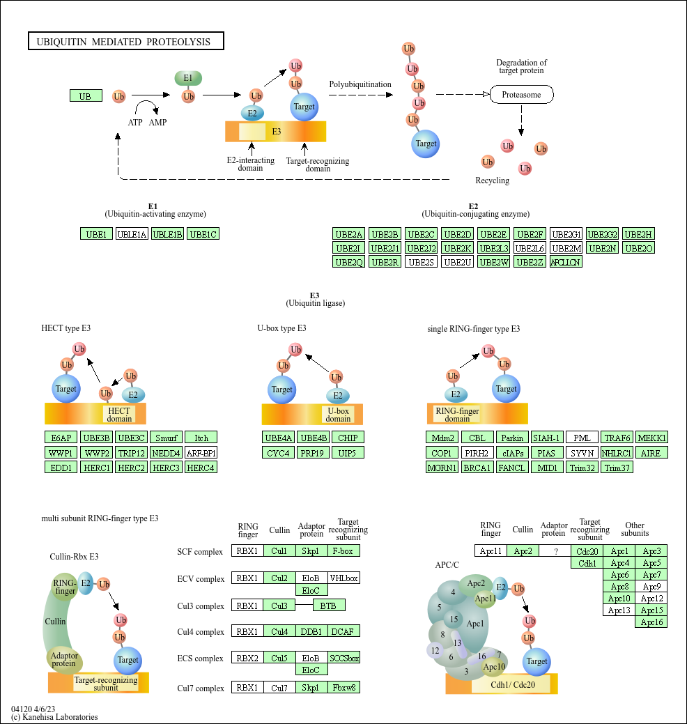 Protein ubiquitination plays an important role in eukaryotic cellular processes. It mainly functions as a signal for 26S proteasome dependent protein degradation. The addition of ubiquitin to proteins being degraded is performed by a reaction cascade consisting of three enzymes, named E1 (ubiquitin activating enzyme), E2 (ubiquitin conjugating enzyme), and E3 (ubiquitin ligase). Each E3 has specificity to its substrate, or proteins to be targeted by ubiquitination. Many E3s are discovered in eukaryotes and they are classified into four types: HECT type, U-box type, single RING-finger type, and multi-subunit RING-finger type. Multi-subunit RING-finger E3s are exemplified by cullin-Rbx E3s and APC/C. They consist of a RING-finger-containing subunit (RBX1 or RBX2) that functions to bind E2s, a scaffold-like cullin molecule, adaptor proteins, and a target recognizing subunit that binds substrates.