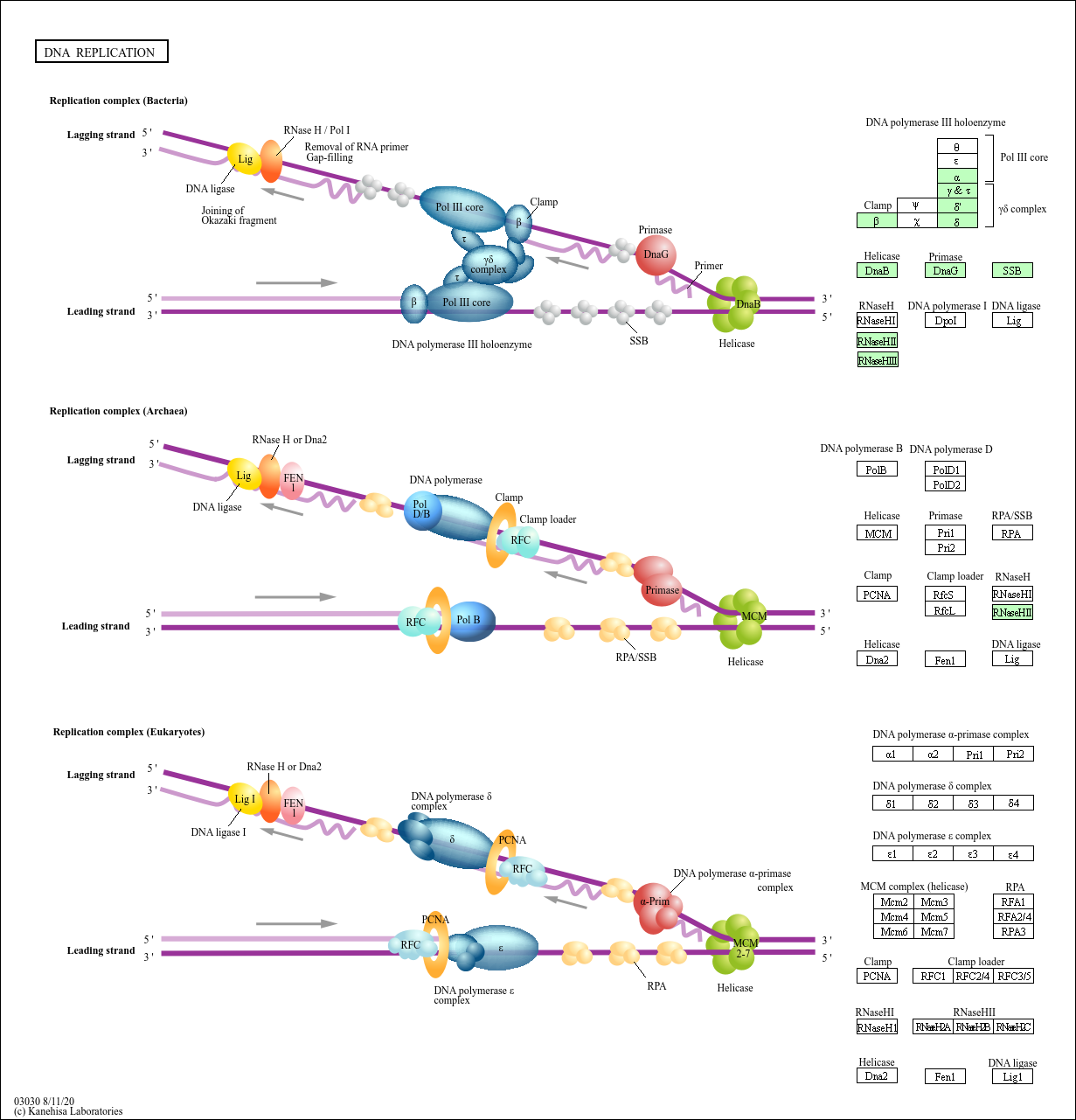 A complex network of interacting proteins and enzymes is required for DNA replication. Generally, DNA replication follows a multistep enzymatic pathway. At the DNA replication fork, a DNA helicase (DnaB or MCM complex) precedes the DNA synthetic machinery and unwinds the duplex parental DNA in cooperation with the SSB or RPA. On the leading strand, replication occurs continuously in a 5 to 3 direction, whereas on the lagging strand, DNA replication occurs discontinuously by synthesis and joining of short Okazaki fragments. In prokaryotes, the leading strand replication apparatus consists of a DNA polymerase (pol III core), a sliding clamp (beta), and a clamp loader (gamma delta complex). The DNA primase (DnaG) is needed to form RNA primers. Normally, during replication of the lagging-strand DNA template, an RNA primer is removed either by an RNase H or by the 5 to 3 exonuclease activity of DNA pol I, and the DNA ligase joins the Okazaki fragments. In eukaryotes, three DNA polymerases (alpha, delta, and epsilon) have been identified. DNA primase forms a permanent complex with DNA polymerase alpha. PCNA and RFC function as a clamp and a clamp loader. FEN 1 and RNase H1 remove the RNA from the Okazaki fragments and DNA ligase I joins the DNA.