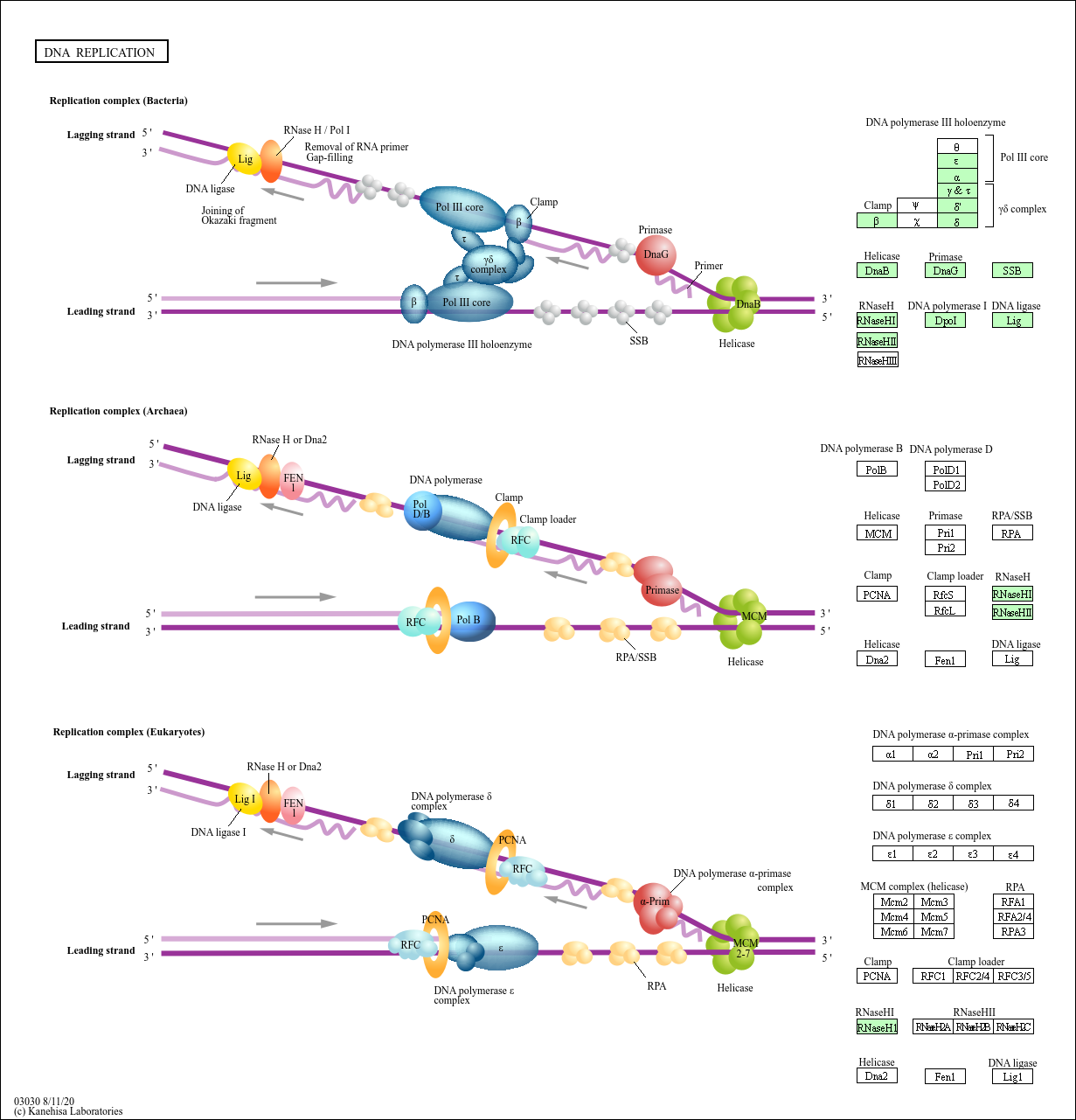 A complex network of interacting proteins and enzymes is required for DNA replication. Generally, DNA replication follows a multistep enzymatic pathway. At the DNA replication fork, a DNA helicase (DnaB or MCM complex) precedes the DNA synthetic machinery and unwinds the duplex parental DNA in cooperation with the SSB or RPA. On the leading strand, replication occurs continuously in a 5 to 3 direction, whereas on the lagging strand, DNA replication occurs discontinuously by synthesis and joining of short Okazaki fragments. In prokaryotes, the leading strand replication apparatus consists of a DNA polymerase (pol III core), a sliding clamp (beta), and a clamp loader (gamma delta complex). The DNA primase (DnaG) is needed to form RNA primers. Normally, during replication of the lagging-strand DNA template, an RNA primer is removed either by an RNase H or by the 5 to 3 exonuclease activity of DNA pol I, and the DNA ligase joins the Okazaki fragments. In eukaryotes, three DNA polymerases (alpha, delta, and epsilon) have been identified. DNA primase forms a permanent complex with DNA polymerase alpha. PCNA and RFC function as a clamp and a clamp loader. FEN 1 and RNase H1 remove the RNA from the Okazaki fragments and DNA ligase I joins the DNA.
