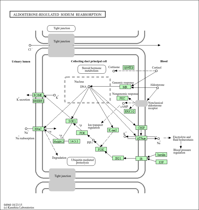 Sodium transport across the tight epithelia of Na+ reabsorbing tissues such as the distal part of the kidney nephron and colon is the major factor determining total-body Na+ levels, and thus, long-term blood pressure. Aldosterone plays a major role in sodium and potassium metabolism by binding to epithelial mineralocorticoid receptors (MR) in the renal collecting duct cells localized in the distal nephron, promoting sodium resorption and potassium excretion. Aldosterone enters a target cell and binds MR, which translocates into the nucleus and regulates gene transcription. Activation of MR leads to increased expression of Sgk-1, which phosphorylates Nedd4-2, an ubiquitin-ligase which targets ENAC to proteosomal degradation. Phosphorylated Nedd4-2 dissociates from ENAC, increasing its apical membrane abundance. Activation of MR also leads to increased expression of Na+/K+-ATPase, thus causing a net increase in sodium uptake from the renal filtrate. The specificity of MR for aldosterone is provided by 11beta-HSD2 by the rapid conversion of cortisol to cortisone in renal cortical collecting duct cells. Recently, besides genomic effects mediated by activated MR, rapid aldosterone actions that are independent of translation and transcription have been documented.