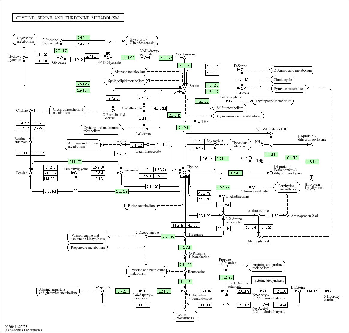 M00020], and glycine is derived from serine. Threonine is an essential amino acid, which animals cannot synthesize. In bacteria and plants, threonine is derived from aspartate [MD:
