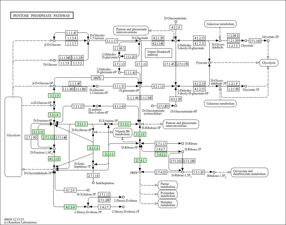 M00005] is an activated compound used in the biosynthesis of histidine and purine/pyrimidine nucleotides. This pathway map also shows the Entner-Doudoroff pathway where 6-P-gluconate is dehydrated and then cleaved into pyruvate and glyceraldehyde-3P [MD: