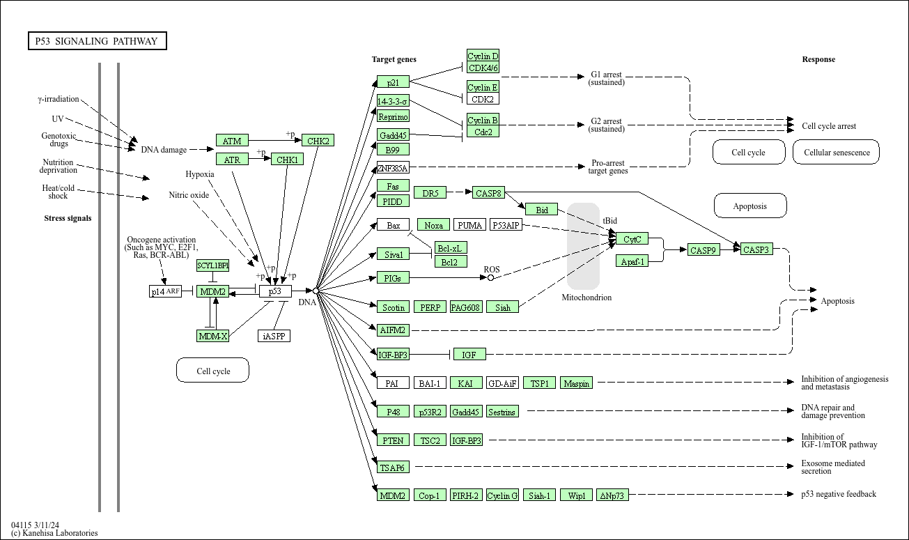 p53 activation is induced by a number of stress signals, including DNA damage, oxidative stress and activated oncogenes. The p53 protein is employed as a transcriptional activator of p53-regulated genes. This results in three major outputs; cell cycle arrest, cellular senescence or apoptosis. Other p53-regulated gene functions communicate with adjacent cells, repair the damaged DNA or set up positive and negative feedback loops that enhance or attenuate the functions of the p53 protein and integrate these stress responses with other signal transduction pathways.