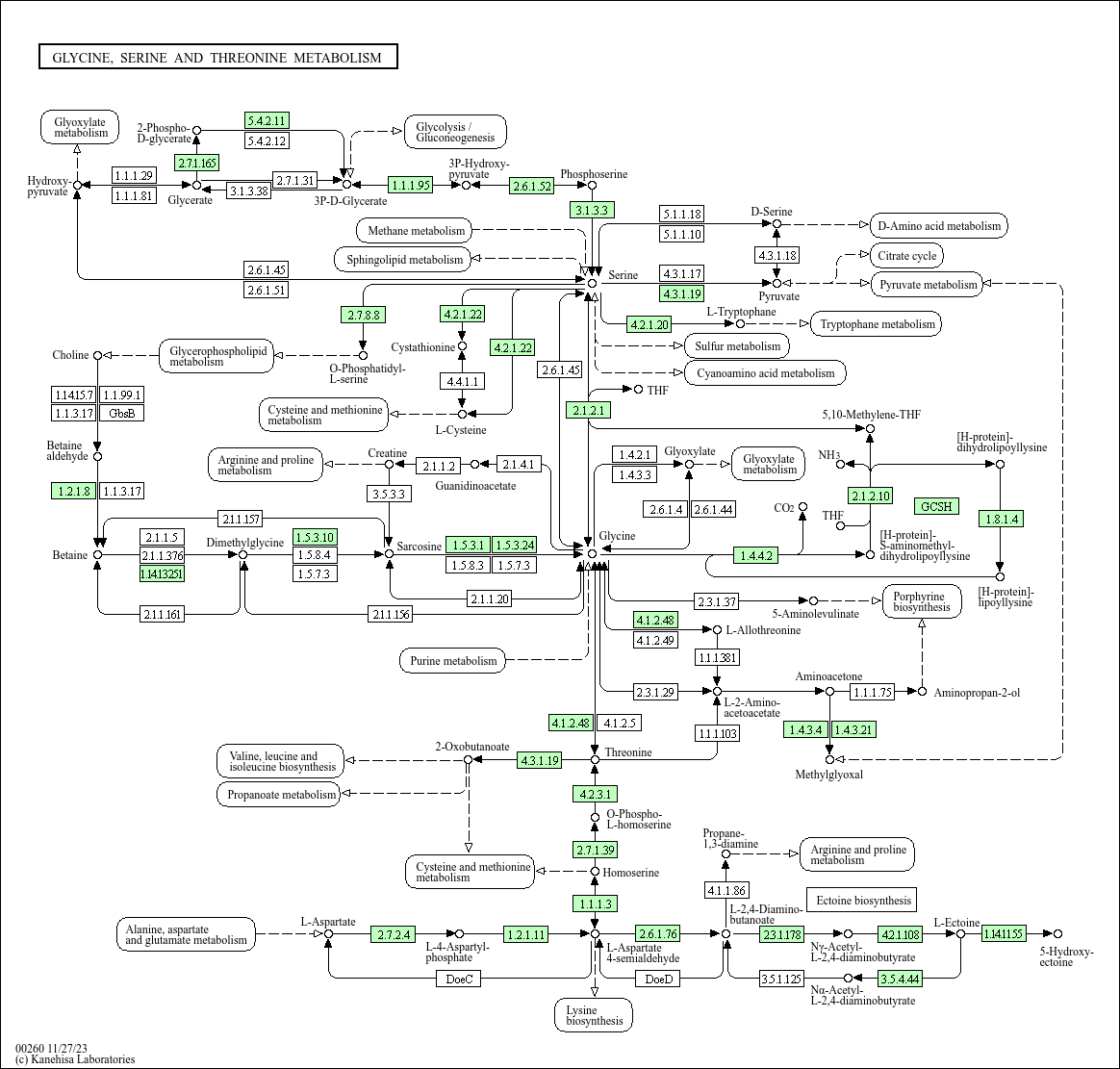 M00020], and glycine is derived from serine. Threonine is an essential amino acid, which animals cannot synthesize. In bacteria and plants, threonine is derived from aspartate [MD: