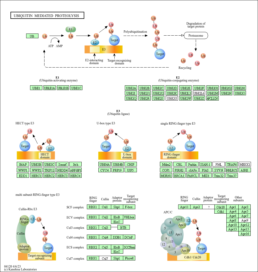 Protein ubiquitination plays an important role in eukaryotic cellular processes. It mainly functions as a signal for 26S proteasome dependent protein degradation. The addition of ubiquitin to proteins being degraded is performed by a reaction cascade consisting of three enzymes, named E1 (ubiquitin activating enzyme), E2 (ubiquitin conjugating enzyme), and E3 (ubiquitin ligase). Each E3 has specificity to its substrate, or proteins to be targeted by ubiquitination. Many E3s are discovered in eukaryotes and they are classified into four types: HECT type, U-box type, single RING-finger type, and multi-subunit RING-finger type. Multi-subunit RING-finger E3s are exemplified by cullin-Rbx E3s and APC/C. They consist of a RING-finger-containing subunit (RBX1 or RBX2) that functions to bind E2s, a scaffold-like cullin molecule, adaptor proteins, and a target recognizing subunit that binds substrates.