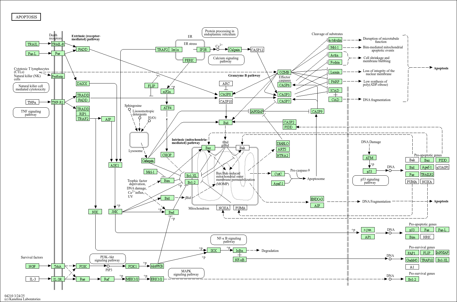 Apoptosis is a genetically programmed process for the elimination of damaged or redundant cells by activation of caspases (aspartate-specific cysteine proteases). The onset of apoptosis is controlled by numerous interrelating processes. The 'extrinsic' pathway involves stimulation of members of the tumor necrosis factor (TNF) receptor subfamily, such as TNFRI, CD95/Fas or TRAILR (death receptors), located at the cell surface, by their specific ligands, such as TNF-alpha, FasL or TRAIL, respectively. The 'intrinsic' pathway is activated mainly by non-receptor stimuli, such as DNA damage, ER stress, metabolic stress, UV radiation or growth-factor deprivation. The central event in the 'intrinsic' pathway is the mitochondrial outer membrane permeabilization (MOMP), which leads to the release of cytochrome c. These two pathways converge at the level of effector caspases, such as caspase-3 and caspase-7. The third major pathway is initiated by the constituents of cytotoxic granules (e.g. Perforin and Granzyme B) that are released by CTLs (cytotoxic T-cells) and NK (natural killer) cells. Granzyme B, similarly to the caspases, cleaves its substrates after aspartic acid residues, suggesting that this protease has the ability to activate members of the caspase family directly. It is the balance between the pro-apoptotic and anti-apoptotic signals that eventually determines whether cells will undergo apoptosis, survive or proliferate. TNF family of ligands activates anti-apoptotic or cell-survival signals as well as apoptotic signals. NGF and Interleukin-3 promotes the survival, proliferation and differentiation of neurons or hematopoietic cells, respectively. Withdrawal of these growth factors leads to cell death, as described above.