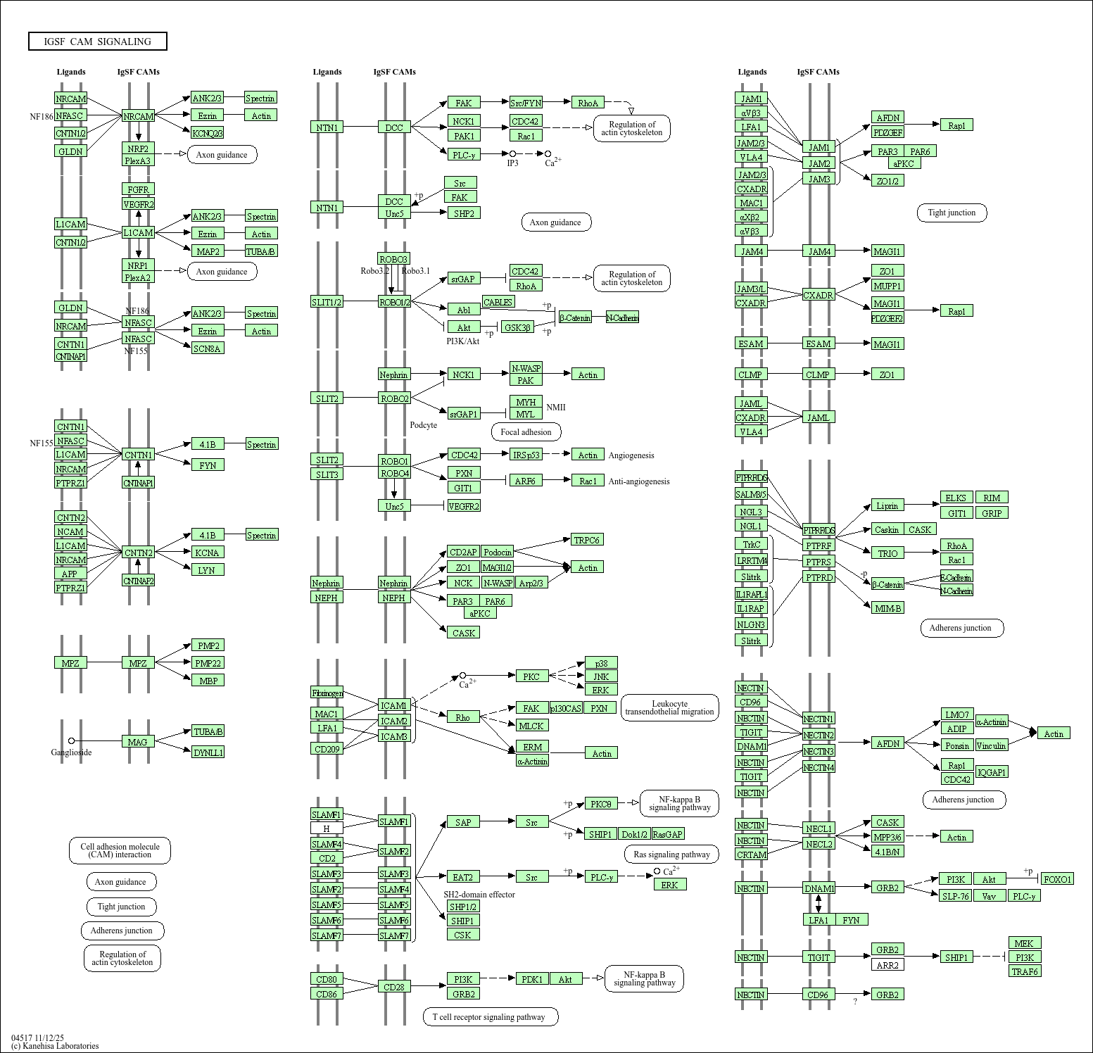 Immunoglobulin superfamily cell adhesion molecules (IgSF CAMs) are cell surface proteins that mediate calcium-independent adhesion via their Ig-like domains. These extracellular regions commonly form homophilic interactions with similar molecules on adjacent cells but can also bind heterophilically to various other molecular partners. Their intracellular tails associate with cytoskeletal and adaptor proteins, linking external adhesion events to intracellular signaling. Through these mechanisms, IgSF CAMs play key roles in both normal physiological regulation and disease processes such as cancer development.