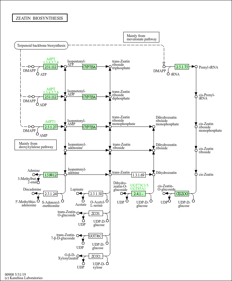 Zeatin is a member of the cytokinin family, a class of phytohormones involved in various processes of growth and development in plants. Most abundant cytokinins are adenine-type, where the N6 position of adenine is substituted with an isoprenoid, such as in zeatin, or an aromatic side chain, such as in kinetin. Zeatin can be synthesized in two different pathways: the tRNA pathway and the AMP pathway. In the tRNA pathway zeatin is a recycled product of isopentenylated tRNAs. In the AMP pathway zeatin is synthesized from an isopentenyl donor, dimethylallyl diphosphate (DMAPP), and AMP, ADP, or ATP by isopentenyltransferases. After synthesis cytokinins can be glucosylated.