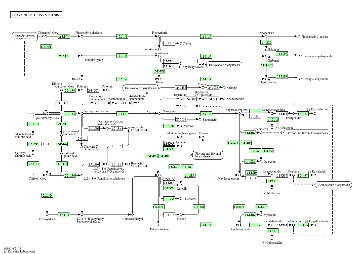 Flavonoids are a major class of plant secondary metabolites that serves a multitude of functions including pigments and antioxidant activity. Flavonoids are synthesized from phenylpropanoid derivatives by condensation with malonyl-CoA. For example, condensation of p-coumaroyl-CoA (C6-C3) with three malonyl-CoA (C3) molecules results in naringenin chalcone with a diphenylpropane (C6-C3-C6) unit, which is converted to naringenin with the flavone (2-phenylchromen-4-one) backbone by conjugate ring closure. These and further modifications yield a variety of structural forms including chalcones, flavanones, dihyroflavonols, and flavans, anthocyanins, flavones and flavonols, and isoflavonoids.