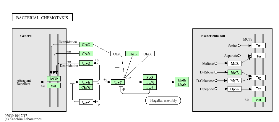 Chemotaxis is the process by which cells sense chemical gradients in their environment and then move towards more favorable conditions. In chemotaxis, events at the receptors control autophosphorylation of the CheA histidine kinase, and the phosphohistidine is the substrate for the response regulator CheY, which catalyzes the transfer of the phosphoryl group to a conserved aspartate. The resulting CheY-P can interact with the switch mechanism in the motor. This interaction causes a change in behavior, such as in direction or speed of rotation of flagella.