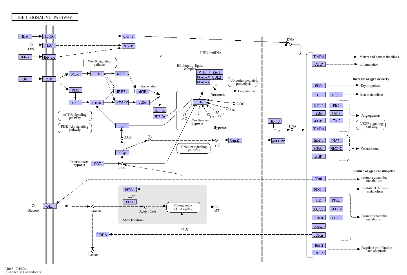 Hypoxia-inducible factor 1 (HIF-1) is a transcription factor that functions as a master regulator of oxygen homeostasis. It consists of two subunits: an inducibly-expressed HIF-1alpha subunit and a constitutively-expressed HIF-1beta subunit. Under normoxia, HIF-1 alpha undergoes hydroxylation at specific prolyl residues which leads to an immediate ubiquitination and subsequent proteasomal degradation of the subunit. In contrast, under hypoxia, HIF-1 alpha subunit becomes stable and interacts with coactivators such as p300/CBP to modulate its transcriptional activity. Eventually, HIF-1 acts as a master regulator of numerous hypoxia-inducible genes under hypoxic conditions. The target genes of HIF-1 encode proteins that increase O2 delivery and mediate adaptive responses to O2 deprivation. Despite its name, HIF-1 is induced not only in response to reduced oxygen availability but also by other stimulants, such as nitric oxide, or various growth factors.