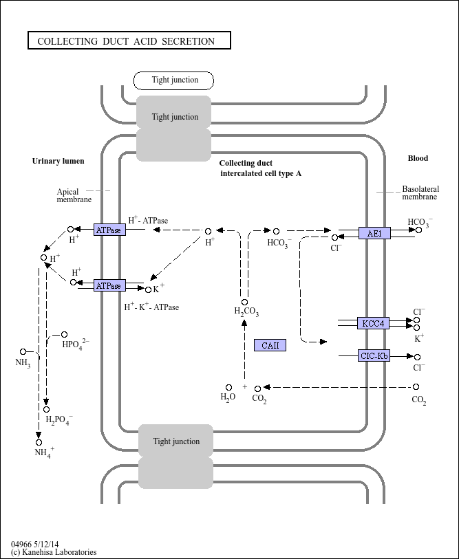 One of the important roles of the collecting duct segment of the kidney nephron is acid secretion. As daily food intake loads acid into the body, urinary acid excretion is essential, and urine pH can drop as low as 4.5. The alpha-intercalated cell of collecting duct is the main responsible for hydrogen secretion into the urine. The carbon dioxide, which is generated in the cells and enters from the blood, is changed to carbonic acid. This carbonic acid is divided into hydrogen ion and bicarbonate ion. Intracellular CA II catalyses the formation of these ions. The hydrogen ion is secreted into the lumen by the luminal H(+)-ATPase. The bicarbonate ion is transported to the blood side by the anion exchanger type 1. Hydrogen ion in the lumen is trapped by urinary buffers. These include ammonium and phosphate.