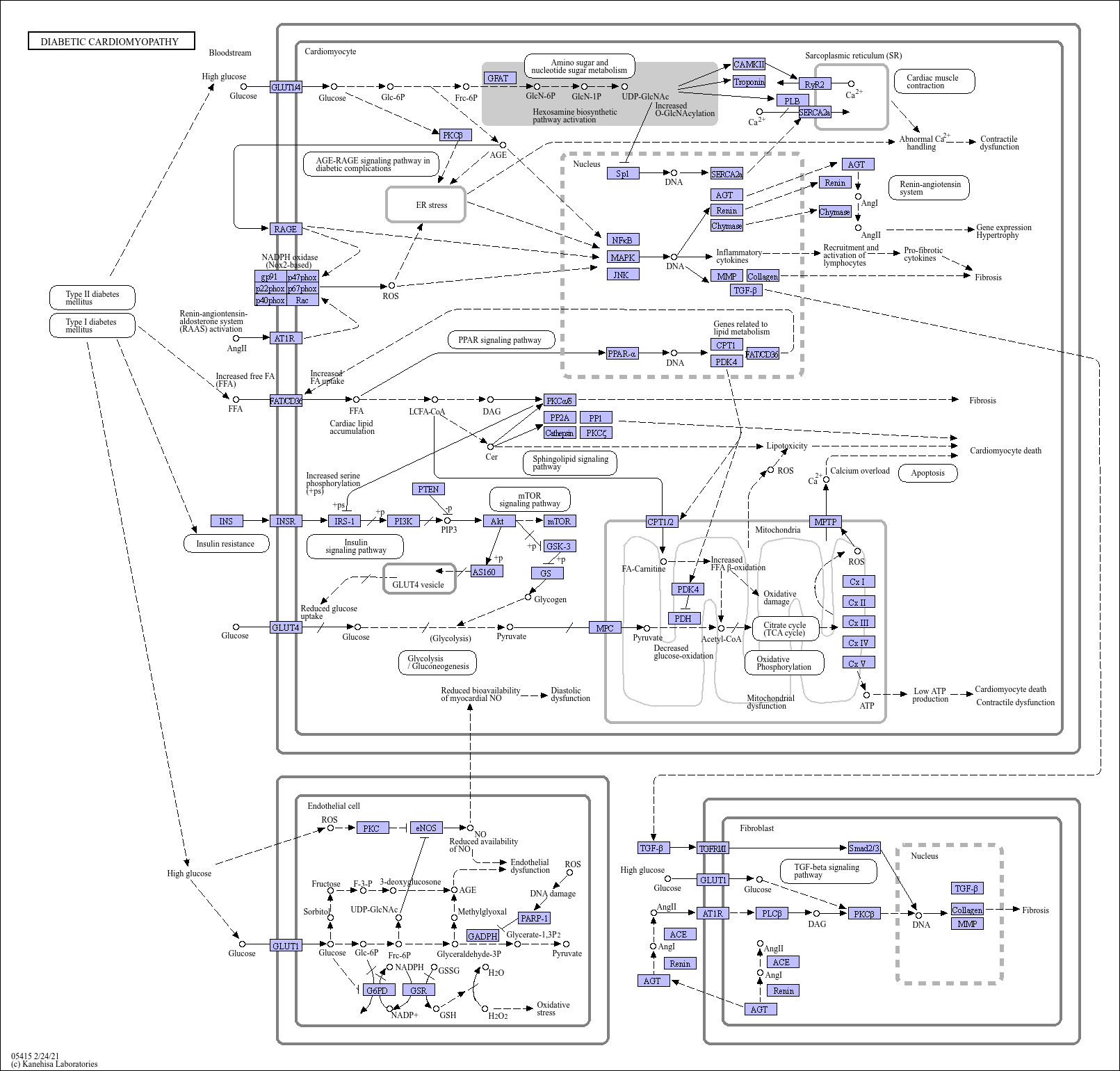 Diabetic cardiomyopathy has been defined as left ventricular dysfunction that occurs among patients with diabetes mellitus independent of a recognized cause such as coronary artery disease or hypertension. The pathogenesis of diabetic cardiomyopathy broadly involves hyperglycemia, increased circulating fatty acids, and insulin resistance contributing to reactive oxygen species (ROS) generation, mitochondrial dysfunction, impaired calcium metabolism, Renin-Angiotensin System (RAS) activation, and altered substrate metabolism. These effects result in cardiac fibrosis, hypertrophy, cardiomyocyte death, contractile dysfunction, endothelial cell damage and eventually heart failure. In the process of cardiac fibrosis, cardiac fibroblasts are the final effector cell.