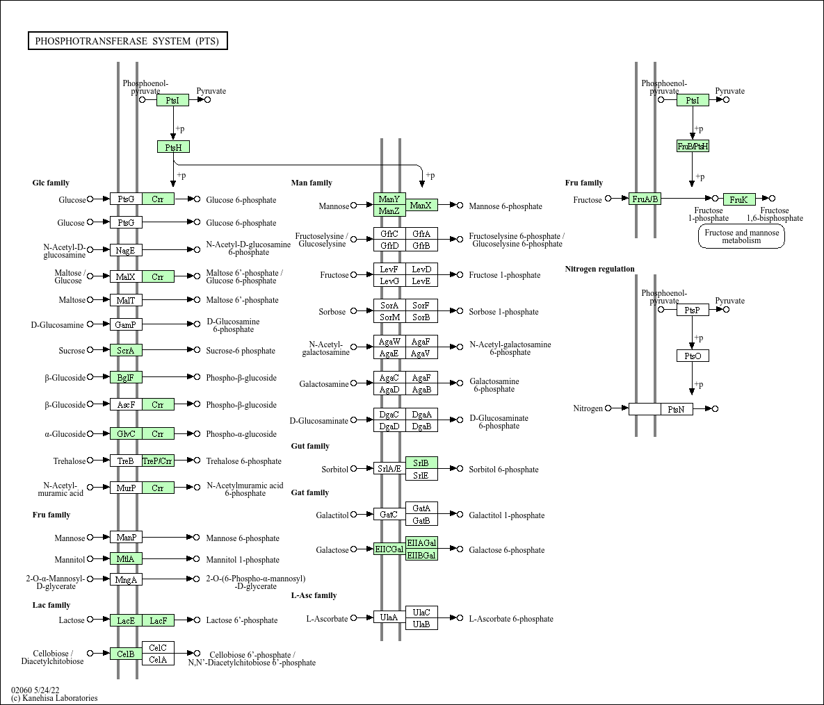 The phosphoenolpyruvate (PEP)-dependent phosphotransferase system (PTS) is a major mechanism used by bacteria for uptake of carbohydrates, particularly hexoses, hexitols, and disaccharides, where the source of energy is from PEP. The PTS consists of two general components, enzyme I (EI) and histidine phosphocarrier protein (HPr), and of membrane-bound sugar specific permeases (enzymes II). Each enzyme II (EII) complex consists of one or two hydrophobic integral membrane domains (domains C and D) and two hydrophilic domains (domains A and B). EII complexes may exist as distinct proteins or as a single multidomain protein. The PTS catalyzes the uptake of carbohydrates and their conversion into their respective phosphoesters during transport. There are four successive phosphoryl transfers in the PTS. Initial autophosphorylation of EI, using PEP as a substrate, is followed by transfer of the phosphoryl group from EI to HPr. EIIA catalyzes the self-phosphoryl transfer from HPr after which the phosphoryl group is transferred to histidine or cysteine residues of EIIB. The sugar is transported through the membrane-bound EIIC and is phosphorylated by the appropriate sugar-specific EIIB.