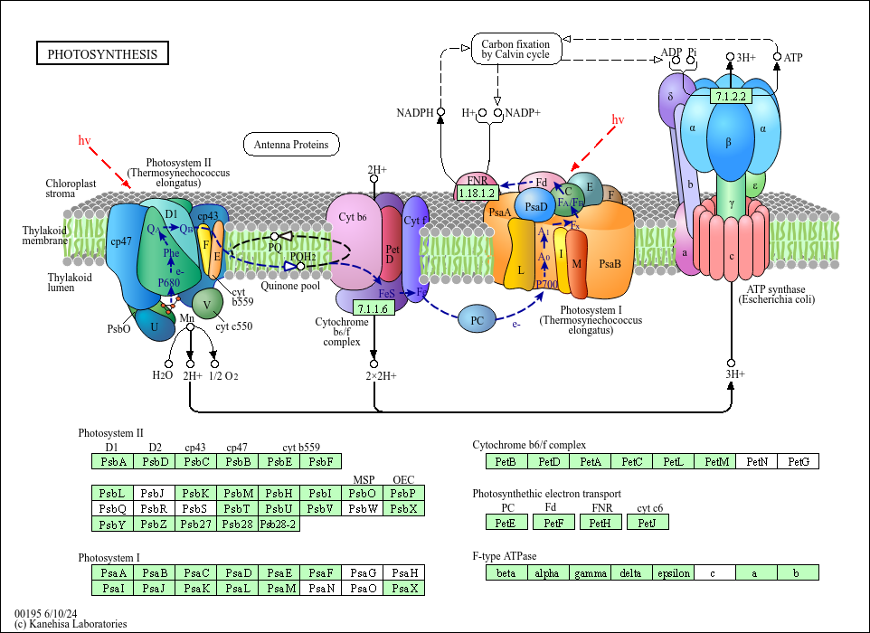Photosynthesis in green plants and specialized bacteria is the process of utilizing light energy to synthesize organic compounds from carbon dioxide and water. It consists of the light dependent part (light reaction) and the light independent part (dark reaction, carbon fixation). The light reaction takes place in thylakoid, a membrane-bound compartment inside chloroplasts and cyanobacteria. The light energy is used by photosystems I and II to generate proton motive force and reducing power (NADPH or NADH). The proton motive force is used by ATP synthase to generate ATP, essentially in the same way as the mitochondrial respiratory chain. The supplies of ATP and NAD(P)H are then used to fix carbon dioxide.