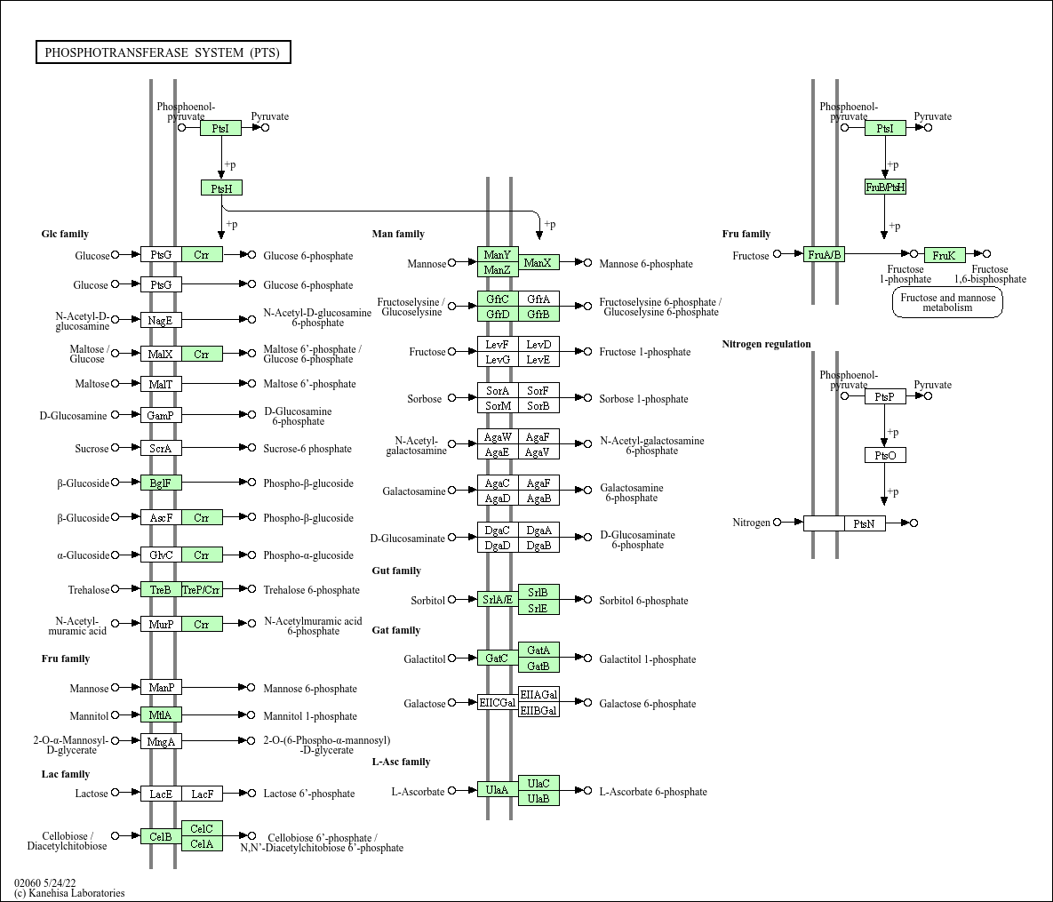 The phosphoenolpyruvate (PEP)-dependent phosphotransferase system (PTS) is a major mechanism used by bacteria for uptake of carbohydrates, particularly hexoses, hexitols, and disaccharides, where the source of energy is from PEP. The PTS consists of two general components, enzyme I (EI) and histidine phosphocarrier protein (HPr), and of membrane-bound sugar specific permeases (enzymes II). Each enzyme II (EII) complex consists of one or two hydrophobic integral membrane domains (domains C and D) and two hydrophilic domains (domains A and B). EII complexes may exist as distinct proteins or as a single multidomain protein. The PTS catalyzes the uptake of carbohydrates and their conversion into their respective phosphoesters during transport. There are four successive phosphoryl transfers in the PTS. Initial autophosphorylation of EI, using PEP as a substrate, is followed by transfer of the phosphoryl group from EI to HPr. EIIA catalyzes the self-phosphoryl transfer from HPr after which the phosphoryl group is transferred to histidine or cysteine residues of EIIB. The sugar is transported through the membrane-bound EIIC and is phosphorylated by the appropriate sugar-specific EIIB.