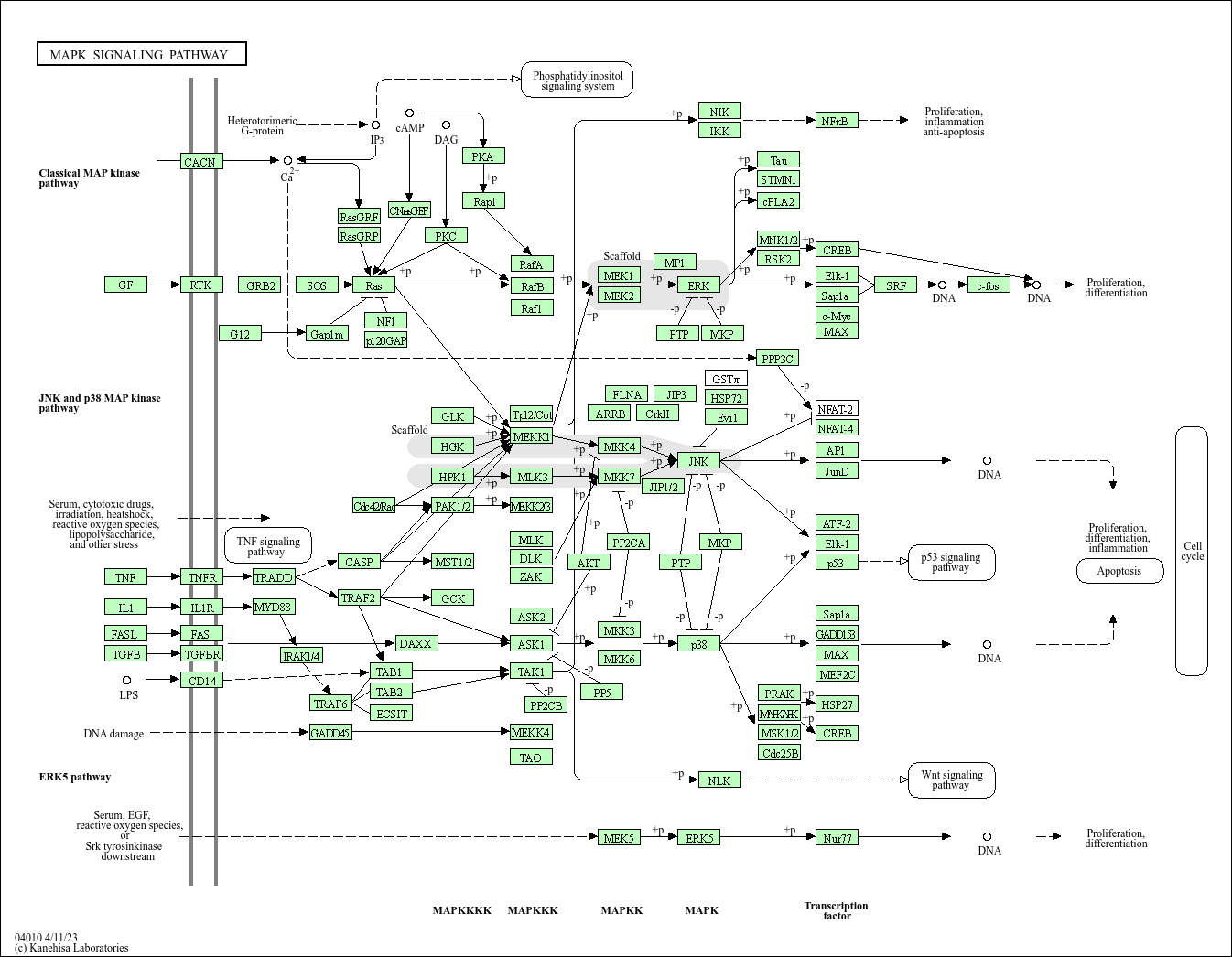 The mitogen-activated protein kinase (MAPK) cascade is a highly conserved module that is involved in various cellular functions, including cell proliferation, differentiation and migration. Mammals express at least four distinctly regulated groups of MAPKs, extracellular signal-related kinases (ERK)-1/2, Jun amino-terminal kinases (JNK1/2/3), p38 proteins (p38alpha/beta/gamma/delta) and ERK5, that are activated by specific MAPKKs: MEK1/2 for ERK1/2, MKK3/6 for the p38, MKK4/7 (JNKK1/2) for the JNKs, and MEK5 for ERK5. Each MAPKK, however, can be activated by more than one MAPKKK, increasing the complexity and diversity of MAPK signalling. Presumably each MAPKKK confers responsiveness to distinct stimuli. For example, activation of ERK1/2 by growth factors depends on the MAPKKK c-Raf, but other MAPKKKs may activate ERK1/2 in response to pro-inflammatory stimuli.