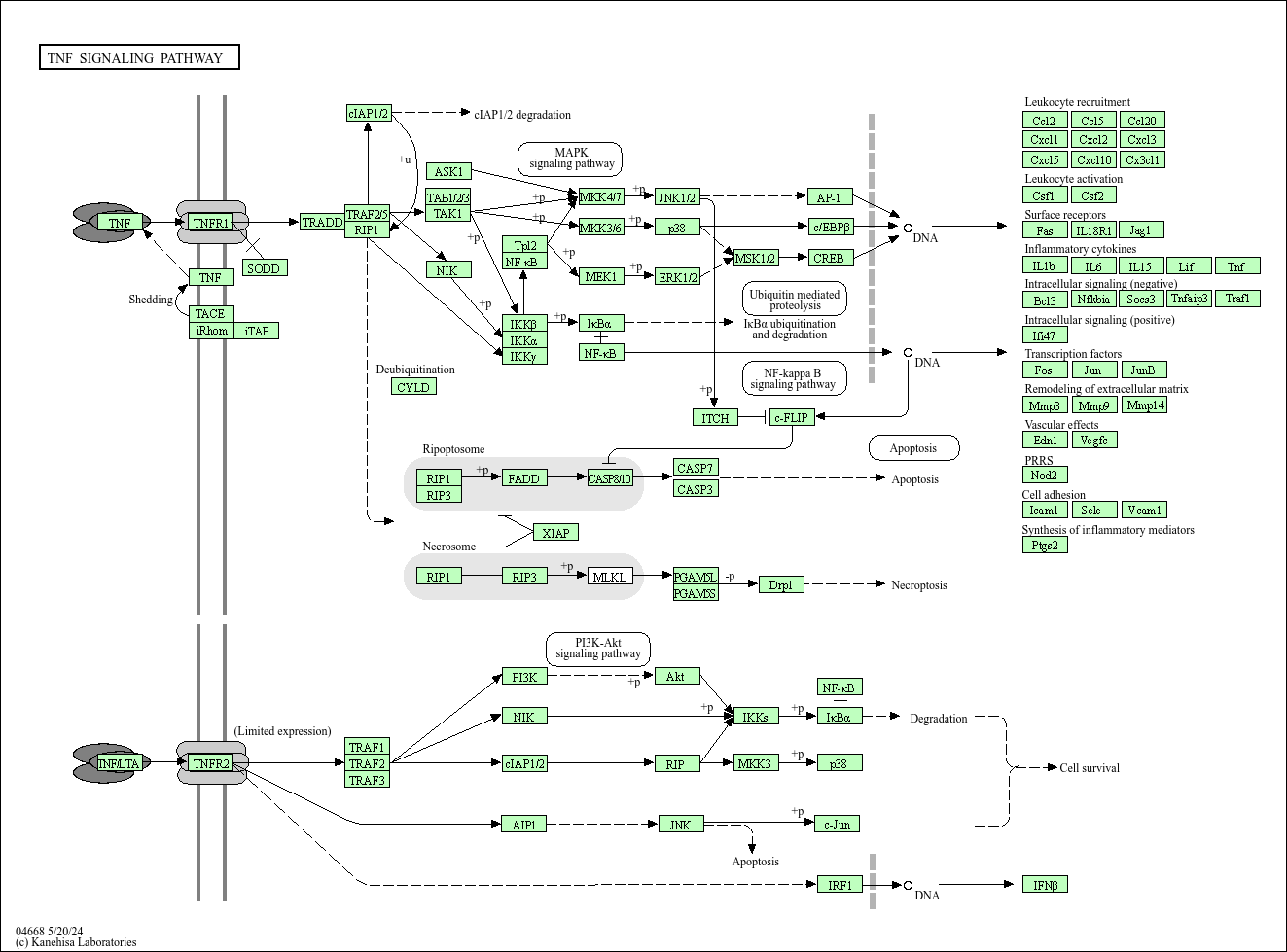 Tumor necrosis factor (TNF), as a critical cytokine, can induce a wide range of intracellular signal pathways including apoptosis and cell survival as well as inflammation and immunity. Activated TNF is assembled to a homotrimer and binds to its receptors (TNFR1, TNFR2) resulting in the trimerization of TNFR1 or TNFR2. TNFR1 is expressed by nearly all cells and is the major receptor for TNF (also called TNF-alpha). In contrast, TNFR2 is expressed in limited cells such as CD4 and CD8 T lymphocytes, endothelial cells, microglia, oligodendrocytes, neuron subtypes, cardiac myocytes, thymocytes and human mesenchymal stem cells. It is the receptor for both TNF and LTA (also called TNF-beta). Upon binding of the ligand, TNFR mediates the association of some adaptor proteins such as TRADD or TRAF2, which in turn initiate recruitment of signal transducers. TNFR1 signaling induces activation of many genes, primarily controlled by two distinct pathways, NF-kappa B pathway and the MAPK cascade, or apoptosis and necroptosis. TNFR2 signaling activates NF-kappa B pathway including PI3K-dependent NF-kappa B pathway and JNK pathway leading to survival.