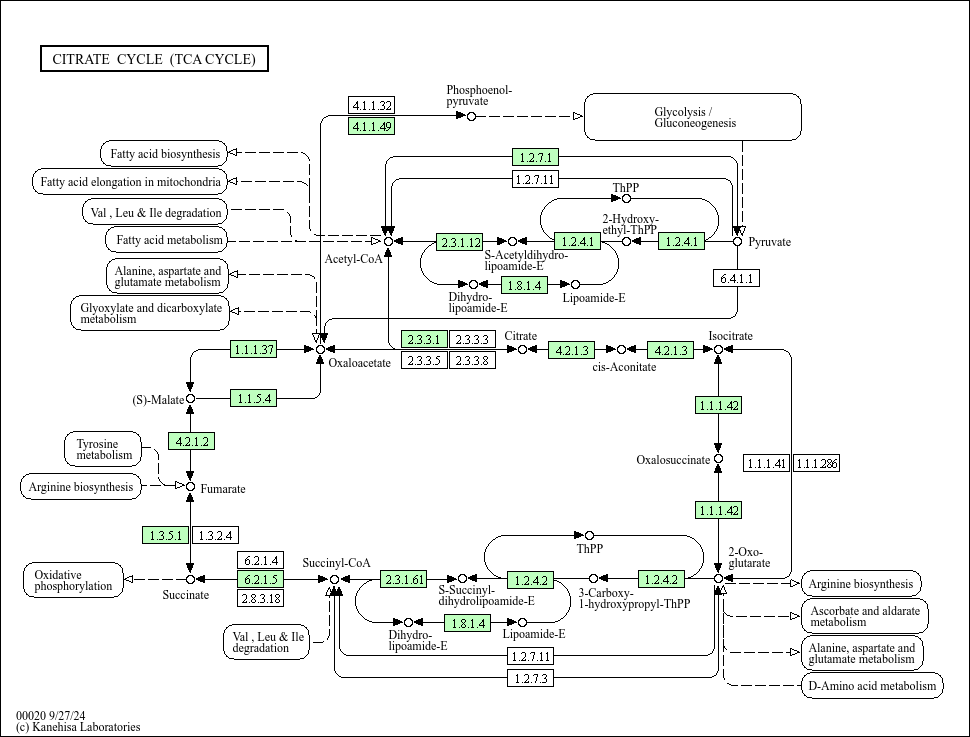 The citrate cycle (TCA cycle, Krebs cycle) is an important aerobic pathway for the final steps of the oxidation of carbohydrates and fatty acids. The cycle starts with acetyl-CoA, the activated form of acetate, derived from glycolysis and pyruvate oxidation for carbohydrates and from beta oxidation of fatty acids. The two-carbon acetyl group in acetyl-CoA is transferred to the four-carbon compound of oxaloacetate to form the six-carbon compound of citrate. In a series of reactions two carbons in citrate are oxidized to CO2 and the reaction pathway supplies NADH for use in the oxidative phosphorylation and other metabolic processes. The pathway also supplies important precursor metabolites including 2-oxoglutarate. At the end of the cycle the remaining four-carbon part is transformed back to oxaloacetate. According to the genome sequence data, many organisms seem to lack genes for the full cycle [MD: