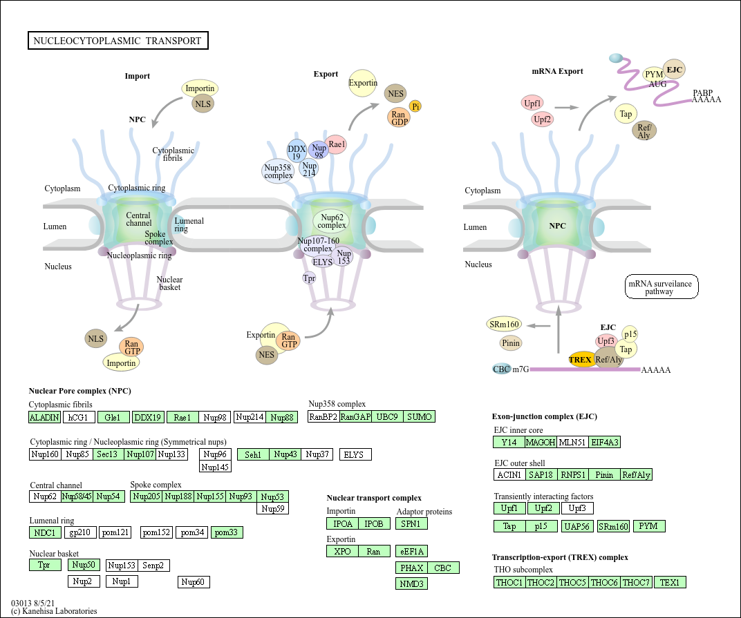 The exchange of molecules between the nucleus and cytoplasm is mediated through nuclear pore complexes (NPCs) embedded in the nuclear envelope. The NPC is composed of highly conserved, distinct structural modules: the inner pore ring, the cytoplasmic and nuclear rings as well as the cytoplasmic filaments and the nuclear basket. Nuclear transport receptors (e.g. importins and exportins) mediate translocation of cargos through the NPC. Cargo proteins harbouring a nuclear export signal (NES) bind to exportins and Ran-GTP to form an export complex in the nucleoplasm. Nuclear export of bulk mRNA is provided by the non-karyopherin transport proteins TAP-p15 in a Ran-GTP-independent manner. Several EJC factors are known to function in mRNA export.
