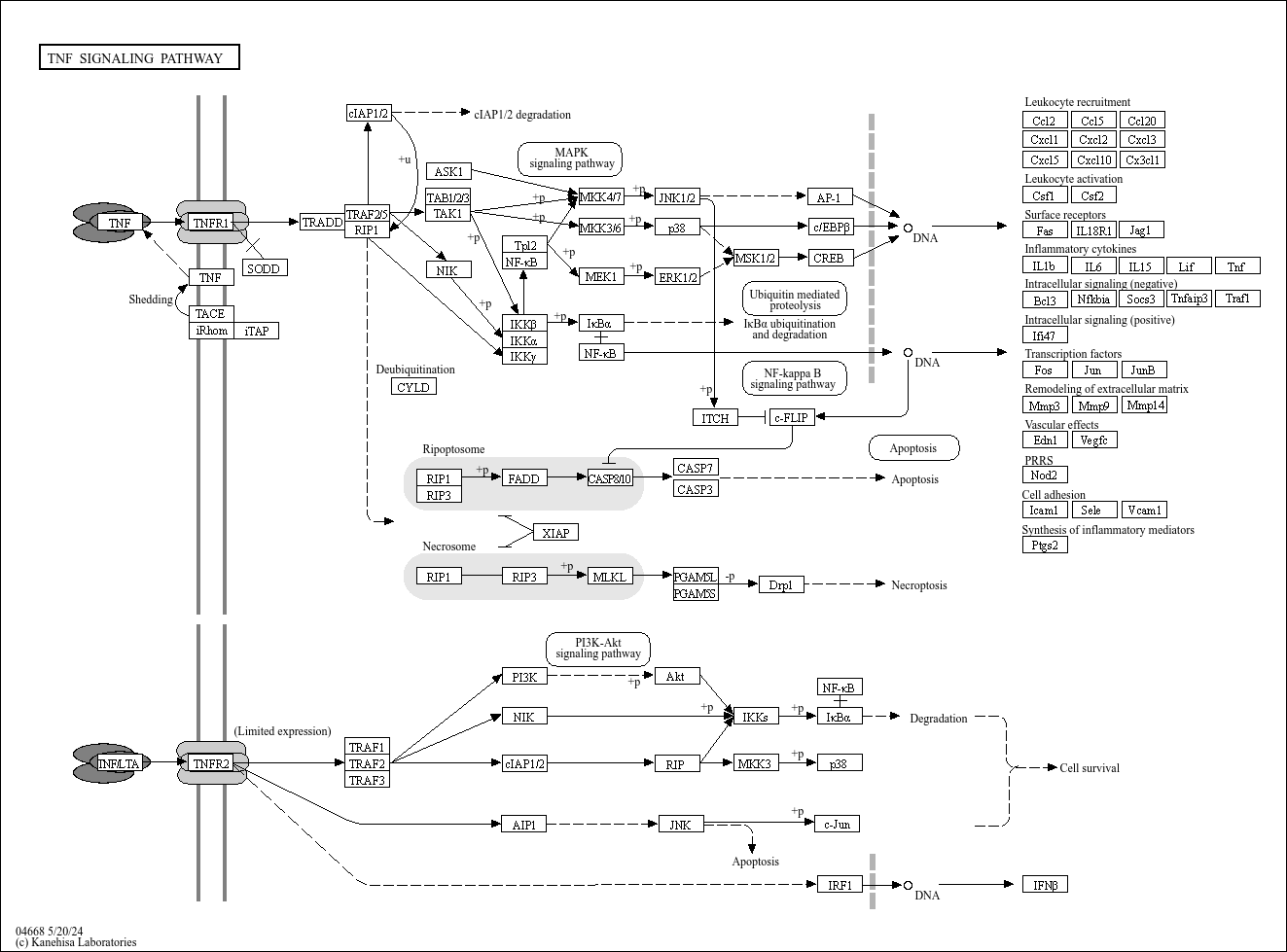 Tumor necrosis factor (TNF), as a critical cytokine, can induce a wide range of intracellular signal pathways including apoptosis and cell survival as well as inflammation and immunity. Activated TNF is assembled to a homotrimer and binds to its receptors (TNFR1, TNFR2) resulting in the trimerization of TNFR1 or TNFR2. TNFR1 is expressed by nearly all cells and is the major receptor for TNF (also called TNF-alpha). In contrast, TNFR2 is expressed in limited cells such as CD4 and CD8 T lymphocytes, endothelial cells, microglia, oligodendrocytes, neuron subtypes, cardiac myocytes, thymocytes and human mesenchymal stem cells. It is the receptor for both TNF and LTA (also called TNF-beta). Upon binding of the ligand, TNFR mediates the association of some adaptor proteins such as TRADD or TRAF2, which in turn initiate recruitment of signal transducers. TNFR1 signaling induces activation of many genes, primarily controlled by two distinct pathways, NF-kappa B pathway and the MAPK cascade, or apoptosis and necroptosis. TNFR2 signaling activates NF-kappa B pathway including PI3K-dependent NF-kappa B pathway and JNK pathway leading to survival.