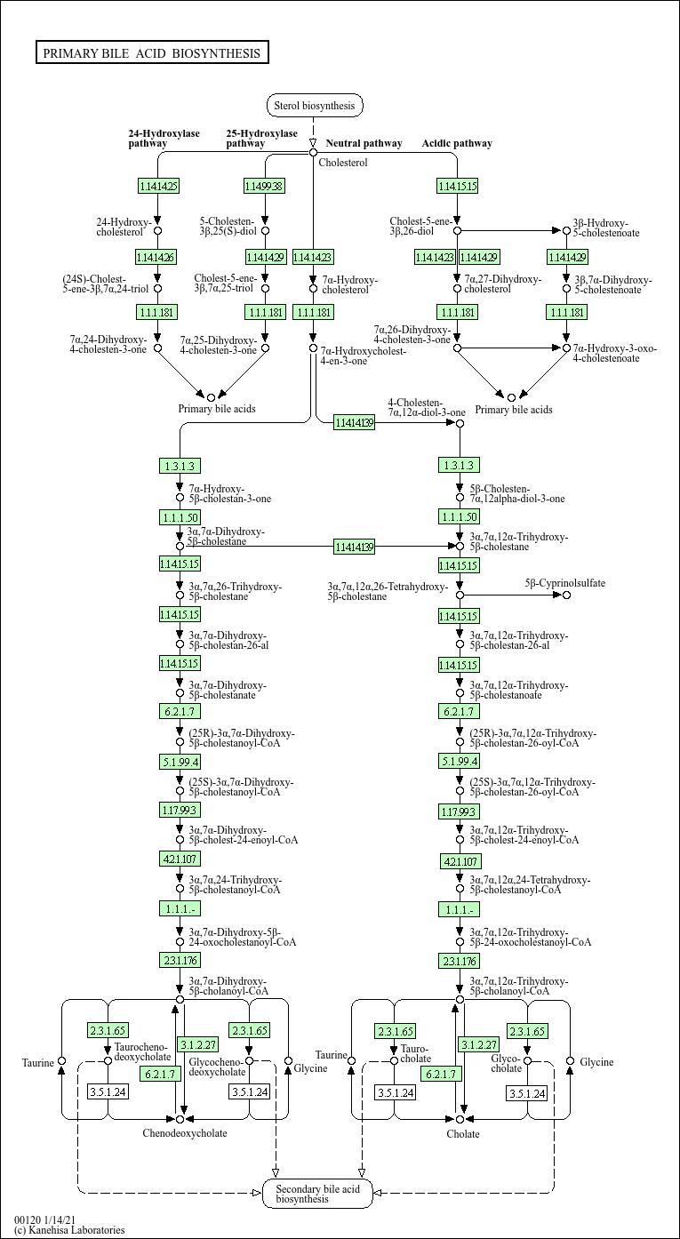 Bile acids are steroid carboxylic acids derived from cholesterol in vertebrates. The primary bile acids, cholic acid and chenodeoxycholic acid, are synthesized in the liver and conjugated with taurine or glycine before secretion via bile into the intestine. The conversion from cholesterol to cholic and chenodeoxycholic acids involves four steps: 1) the initiation of synthesis by 7alpha-hydroxylation of sterol precursors, 2) further modifications to the ring structures, 3) side-chain oxidation and shortening (cleavage) by three carbons, and 4) conjugation of the bile acid with taurine or glycine.