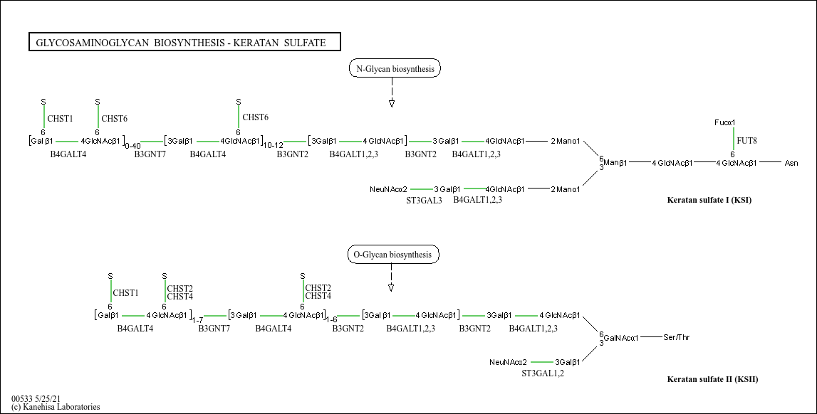 Keratan sulfate (KS) is a glycosaminoglycan with the basic disaccharide unit of N-acetyllactosamine, Gal(b1-4)GlcNAc(b1-3), with sulfate esters at C-6 of GlcNAc and Gal residues. There are two types of KS distinguished by the protein linkage: type I for N-linked via the N-glycan core structure and type II for O-linked via the O-glycan core 2 structure.