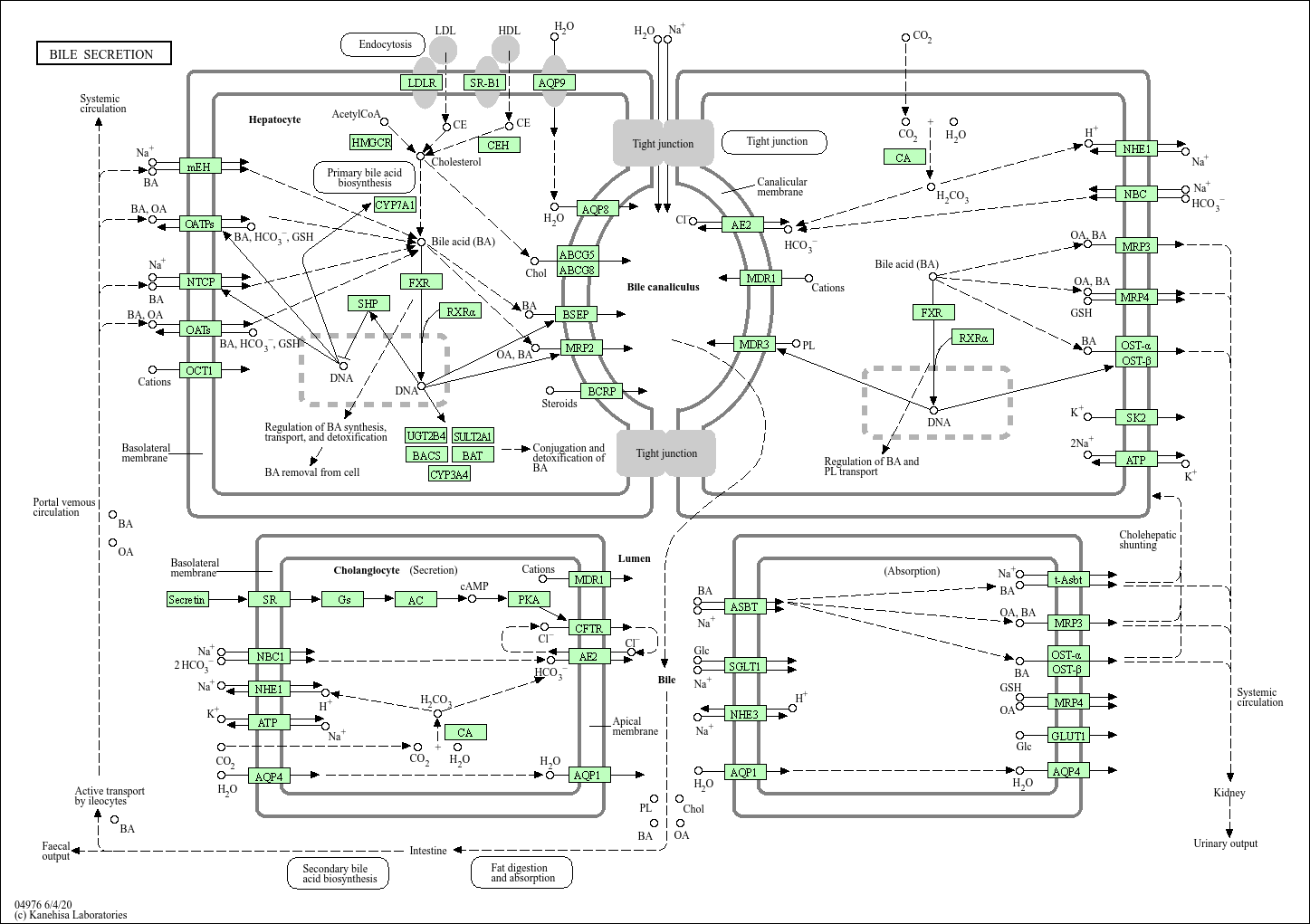 Bile is a vital secretion, essential for digestion and absorption of fats and fat-soluble vitamins in the small intestine. Moreover, bile is an important route of elimination for excess cholesterol and many waste product, bilirubin, drugs and toxic compounds. Bile secretion depends on the function of membrane transport systems in hepatocytes and cholangiocytes and on the structural and functional integrity of the biliary tree. The hepatocytes generate the so-called primary bile in their canaliculi. Cholangiocytes modify the canalicular bile by secretory and reabsorptive processes as bile passes through the bile ducts. The main solutes in bile are bile acids, which stimulate bile secretion osmotically, as well as facilitate the intestinal absorption of dietary lipids by their detergent properties. Bile acids are also important signalling molecules. Through the activation of nuclear receptors, they regulate their own synthesis and transport rates.