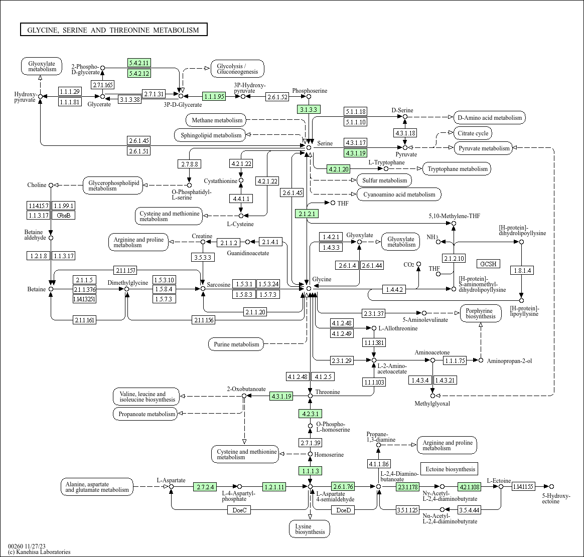 M00020], and glycine is derived from serine. Threonine is an essential amino acid, which animals cannot synthesize. In bacteria and plants, threonine is derived from aspartate [MD: