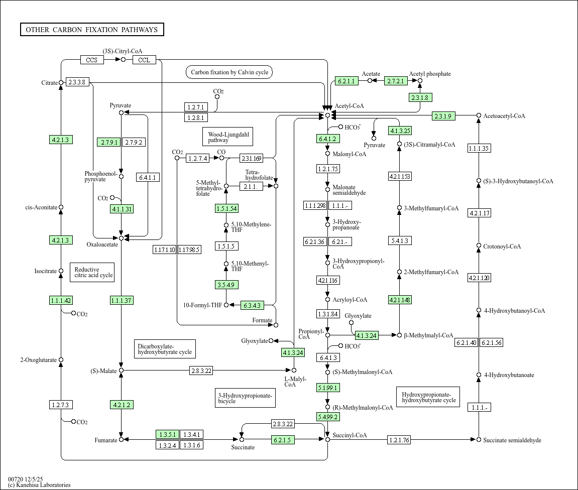 M00165]. There are, at least, five additional carbon fixation pathways known to exist in autotrophic bacteria and archaea, which differ in reducing compounds, energy source, and oxygen sensitivity of enzymes. (i) The reductive citric acid cycle (Arnon-Buchanan cycle) [MD:
