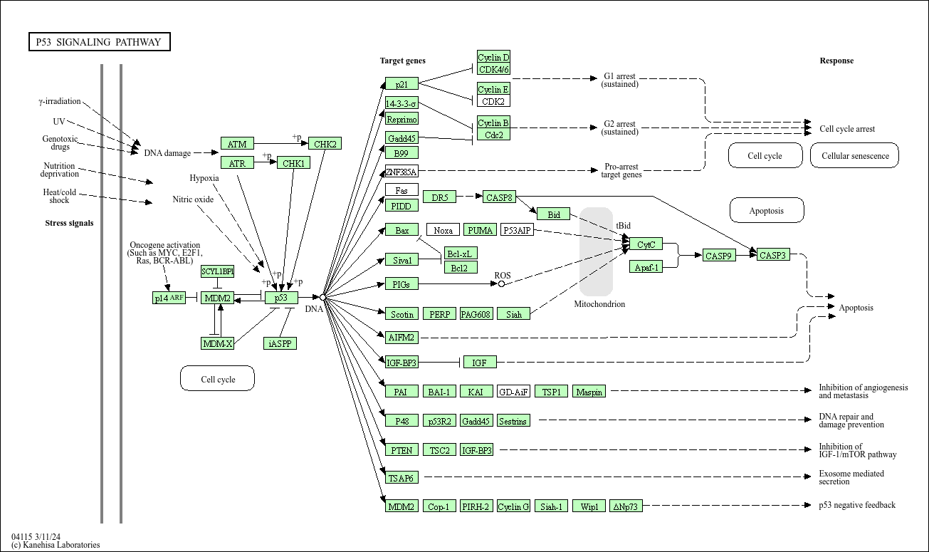 p53 activation is induced by a number of stress signals, including DNA damage, oxidative stress and activated oncogenes. The p53 protein is employed as a transcriptional activator of p53-regulated genes. This results in three major outputs; cell cycle arrest, cellular senescence or apoptosis. Other p53-regulated gene functions communicate with adjacent cells, repair the damaged DNA or set up positive and negative feedback loops that enhance or attenuate the functions of the p53 protein and integrate these stress responses with other signal transduction pathways.