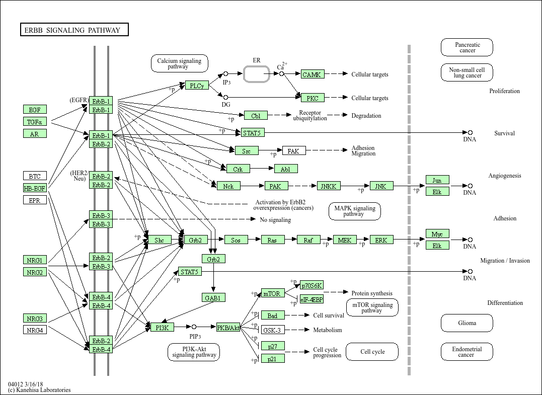 The ErbB family of receptor tyrosine kinases (RTKs) couples binding of extracellular growth factor ligands to intracellular signaling pathways regulating diverse biologic responses, including proliferation, differentiation, cell motility, and survival. Ligand binding to the four closely related members of this RTK family -epidermal growth factor receptor (EGFR, also known as ErbB-1 or HER1), ErbB-2 (HER2), ErbB-3 (HER3), and ErbB-4 (HER4)-induces the formation of receptor homo- and heterodimers and the activation of the intrinsic kinase domain, resulting in phosphorylation on specific tyrosine residues (pY) within the cytoplasmic tail. Signaling effectors containing binding pockets for pY-containing peptides are recruited to activated receptors and induce the various signaling pathways. The Shc- and/or Grb2-activated mitogen-activated protein kinase (MAPK) pathway is a common target downstream of all ErbB receptors. Similarly, the phosphatidylinositol-3-kinase (PI-3K) pathway is directly or indirectly activated by most ErbBs. Several cytoplasmic docking proteins appear to be recruited by specific ErbB receptors and less exploited by others. These include the adaptors Crk, Nck, the phospholipase C gamma (PLCgamma), the intracellular tyrosine kinase Src, or the Cbl E3 ubiquitin protein ligase.