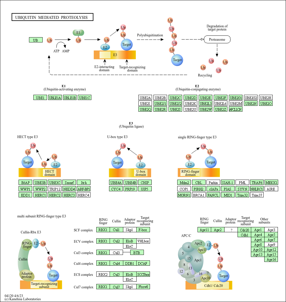 Protein ubiquitination plays an important role in eukaryotic cellular processes. It mainly functions as a signal for 26S proteasome dependent protein degradation. The addition of ubiquitin to proteins being degraded is performed by a reaction cascade consisting of three enzymes, named E1 (ubiquitin activating enzyme), E2 (ubiquitin conjugating enzyme), and E3 (ubiquitin ligase). Each E3 has specificity to its substrate, or proteins to be targeted by ubiquitination. Many E3s are discovered in eukaryotes and they are classified into four types: HECT type, U-box type, single RING-finger type, and multi-subunit RING-finger type. Multi-subunit RING-finger E3s are exemplified by cullin-Rbx E3s and APC/C. They consist of a RING-finger-containing subunit (RBX1 or RBX2) that functions to bind E2s, a scaffold-like cullin molecule, adaptor proteins, and a target recognizing subunit that binds substrates.