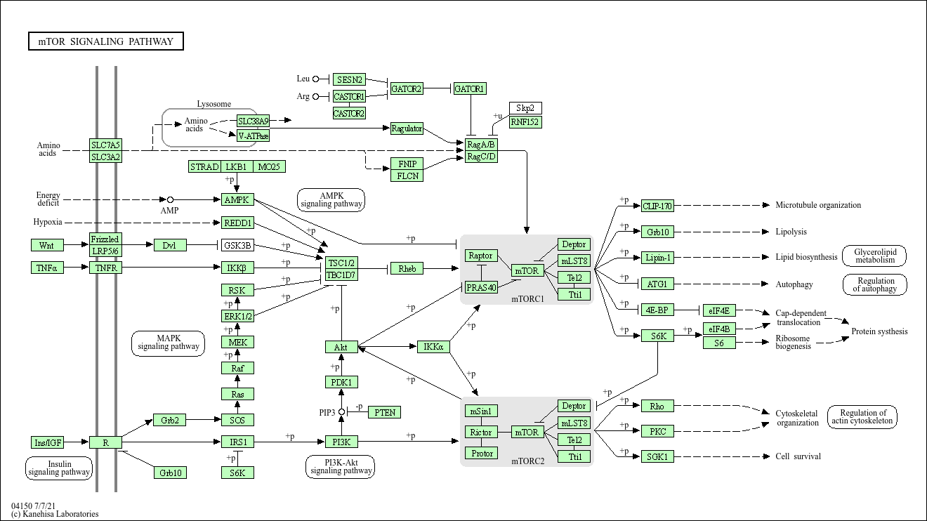The mammalian (mechanistic) target of rapamycin (mTOR) is a highly conserved serine/threonine protein kinase, which exists in two complexes termed mTOR complex 1 (mTORC1) and 2 (mTORC2). mTORC1 contains mTOR, Raptor, PRAS40, Deptor, mLST8, Tel2 and Tti1. mTORC1 is activated by the presence of growth factors, amino acids, energy status, stress and oxygen levels to regulate several biological processes, including lipid metabolism, autophagy, protein synthesis and ribosome biogenesis. On the other hand, mTORC2, which consists of mTOR, mSin1, Rictor, Protor, Deptor, mLST8, Tel2 and Tti1, responds to growth factors and controls cytoskeletal organization, metabolism and survival.