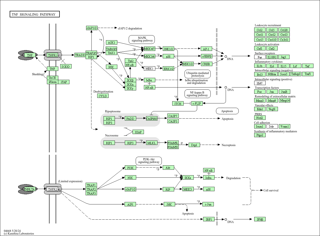 Tumor necrosis factor (TNF), as a critical cytokine, can induce a wide range of intracellular signal pathways including apoptosis and cell survival as well as inflammation and immunity. Activated TNF is assembled to a homotrimer and binds to its receptors (TNFR1, TNFR2) resulting in the trimerization of TNFR1 or TNFR2. TNFR1 is expressed by nearly all cells and is the major receptor for TNF (also called TNF-alpha). In contrast, TNFR2 is expressed in limited cells such as CD4 and CD8 T lymphocytes, endothelial cells, microglia, oligodendrocytes, neuron subtypes, cardiac myocytes, thymocytes and human mesenchymal stem cells. It is the receptor for both TNF and LTA (also called TNF-beta). Upon binding of the ligand, TNFR mediates the association of some adaptor proteins such as TRADD or TRAF2, which in turn initiate recruitment of signal transducers. TNFR1 signaling induces activation of many genes, primarily controlled by two distinct pathways, NF-kappa B pathway and the MAPK cascade, or apoptosis and necroptosis. TNFR2 signaling activates NF-kappa B pathway including PI3K-dependent NF-kappa B pathway and JNK pathway leading to survival.