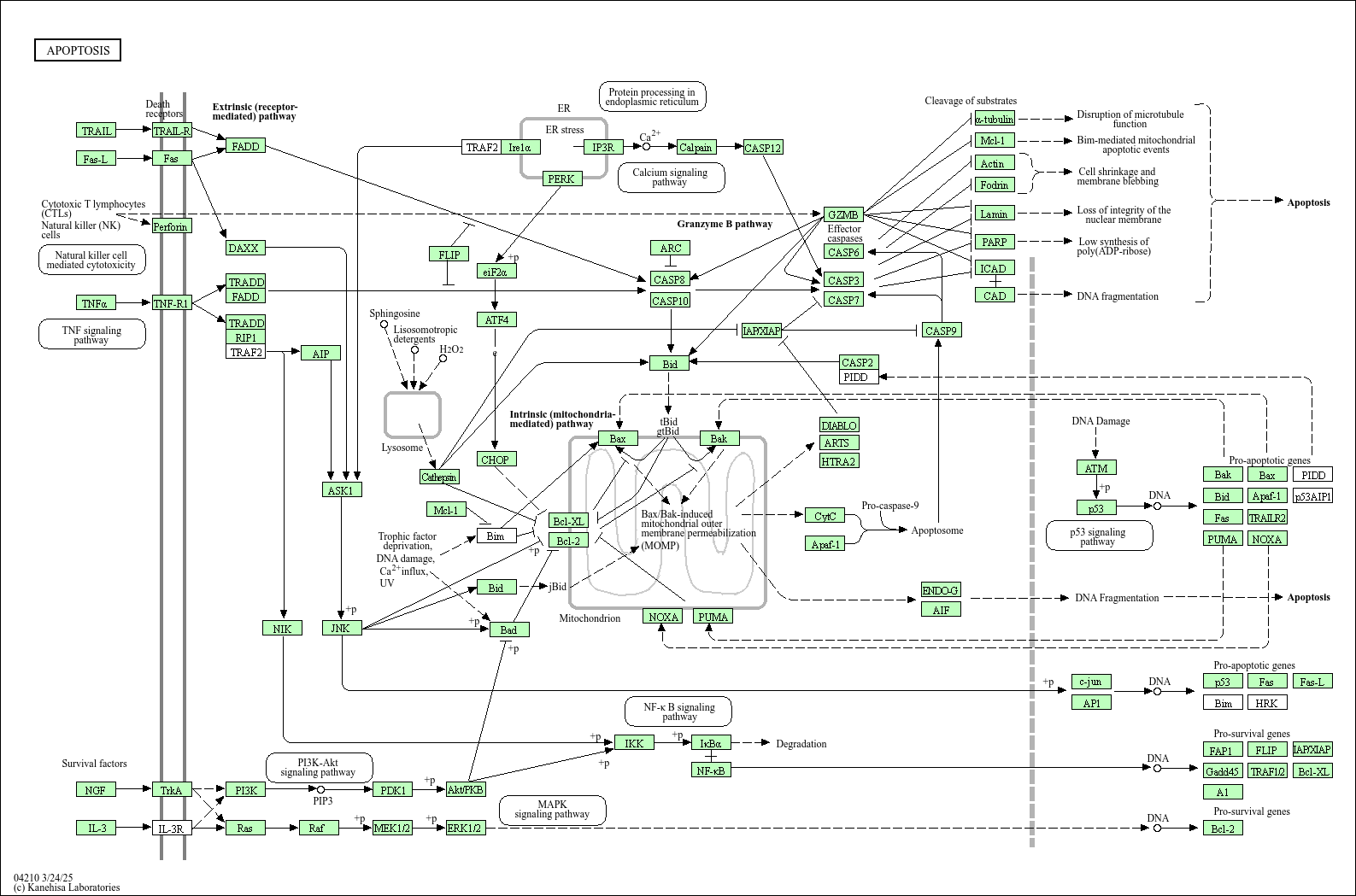 Apoptosis is a genetically programmed process for the elimination of damaged or redundant cells by activation of caspases (aspartate-specific cysteine proteases). The onset of apoptosis is controlled by numerous interrelating processes. The 'extrinsic' pathway involves stimulation of members of the tumor necrosis factor (TNF) receptor subfamily, such as TNFRI, CD95/Fas or TRAILR (death receptors), located at the cell surface, by their specific ligands, such as TNF-alpha, FasL or TRAIL, respectively. The 'intrinsic' pathway is activated mainly by non-receptor stimuli, such as DNA damage, ER stress, metabolic stress, UV radiation or growth-factor deprivation. The central event in the 'intrinsic' pathway is the mitochondrial outer membrane permeabilization (MOMP), which leads to the release of cytochrome c. These two pathways converge at the level of effector caspases, such as caspase-3 and caspase-7. The third major pathway is initiated by the constituents of cytotoxic granules (e.g. Perforin and Granzyme B) that are released by CTLs (cytotoxic T-cells) and NK (natural killer) cells. Granzyme B, similarly to the caspases, cleaves its substrates after aspartic acid residues, suggesting that this protease has the ability to activate members of the caspase family directly. It is the balance between the pro-apoptotic and anti-apoptotic signals that eventually determines whether cells will undergo apoptosis, survive or proliferate. TNF family of ligands activates anti-apoptotic or cell-survival signals as well as apoptotic signals. NGF and Interleukin-3 promotes the survival, proliferation and differentiation of neurons or hematopoietic cells, respectively. Withdrawal of these growth factors leads to cell death, as described above.