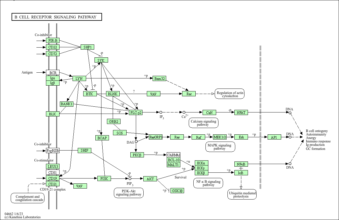 B cells are an important component of adaptive immunity. They produce and secrete millions of different antibody molecules, each of which recognizes a different (foreign) antigen. The B cell receptor (BCR) is an integral membrane protein complex that is composed of two immunoglobulin (Ig) heavy chains, two Ig light chains and two heterodimers of Ig-alpha and Ig-beta. After BCR ligation by antigen, three main protein tyrosine kinases (PTKs) -the SRC-family kinase LYN, SYK and the TEC-family kinase BTK- are activated. Phosphatidylinositol 3-kinase (PI3K) and phospholipase C-gamma 2 (PLC-gamma 2) are important downstream effectors of BCR signalling. This signalling ultimately results in the expression of immediate early genes that further activate the expression of other genes involved in B cell proliferation, differentiation and Ig production as well as other processes.