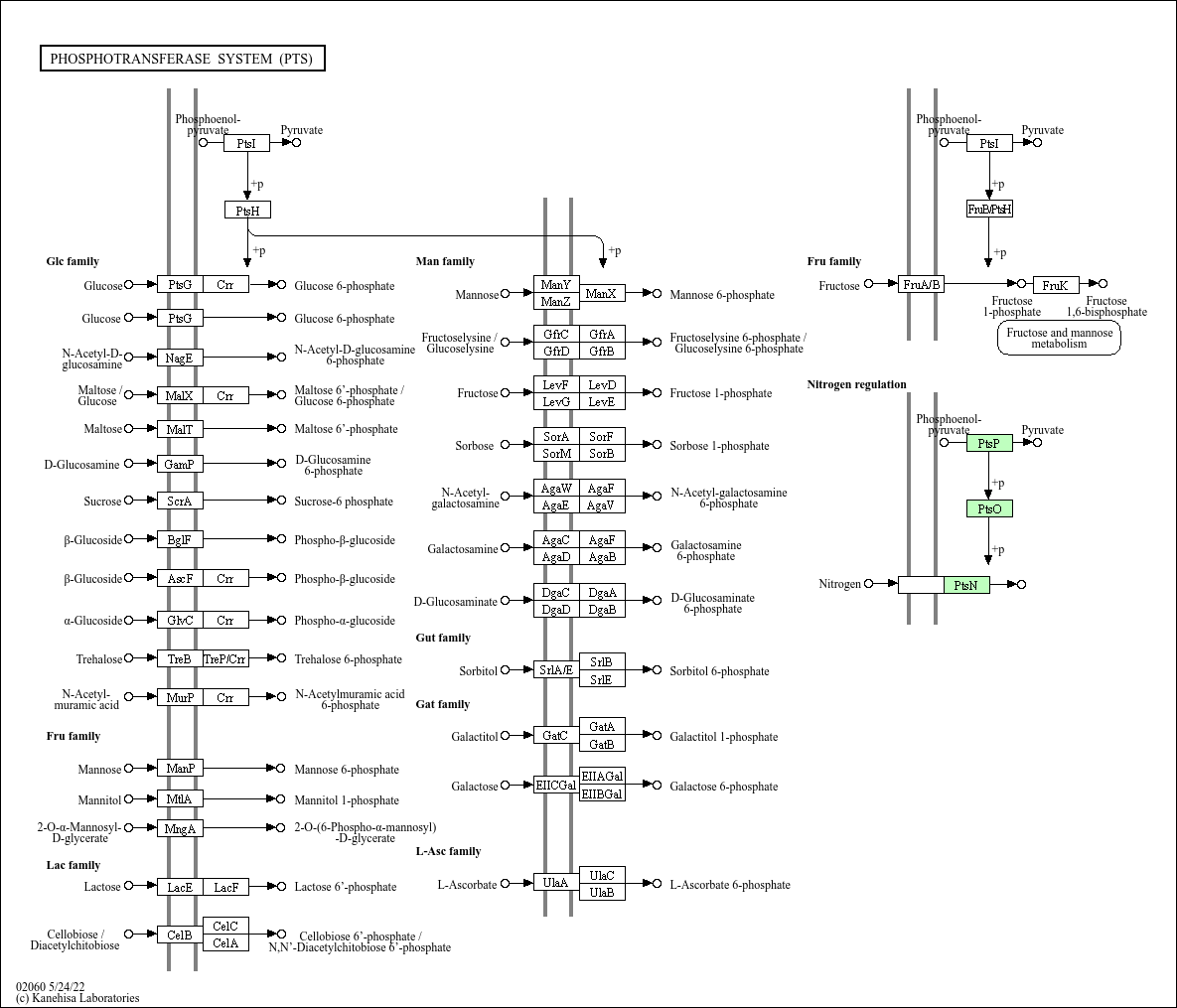 The phosphoenolpyruvate (PEP)-dependent phosphotransferase system (PTS) is a major mechanism used by bacteria for uptake of carbohydrates, particularly hexoses, hexitols, and disaccharides, where the source of energy is from PEP. The PTS consists of two general components, enzyme I (EI) and histidine phosphocarrier protein (HPr), and of membrane-bound sugar specific permeases (enzymes II). Each enzyme II (EII) complex consists of one or two hydrophobic integral membrane domains (domains C and D) and two hydrophilic domains (domains A and B). EII complexes may exist as distinct proteins or as a single multidomain protein. The PTS catalyzes the uptake of carbohydrates and their conversion into their respective phosphoesters during transport. There are four successive phosphoryl transfers in the PTS. Initial autophosphorylation of EI, using PEP as a substrate, is followed by transfer of the phosphoryl group from EI to HPr. EIIA catalyzes the self-phosphoryl transfer from HPr after which the phosphoryl group is transferred to histidine or cysteine residues of EIIB. The sugar is transported through the membrane-bound EIIC and is phosphorylated by the appropriate sugar-specific EIIB.