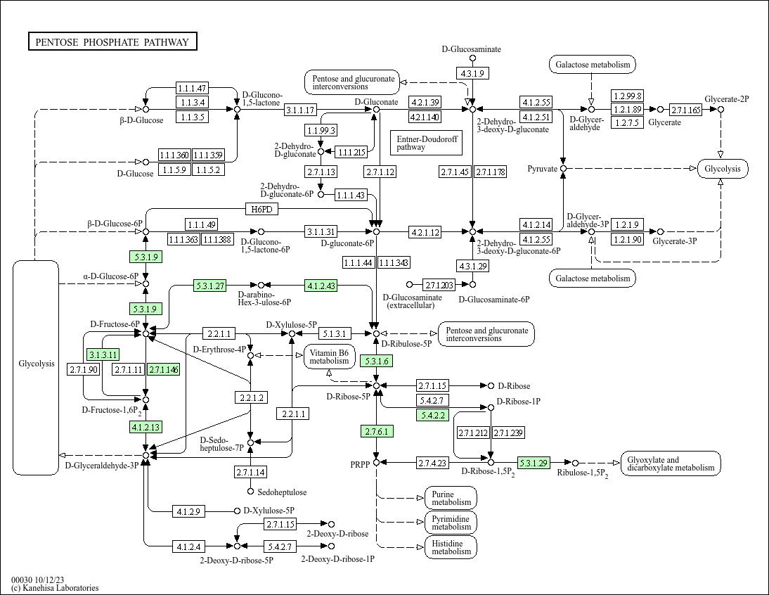 M00005] is an activated compound used in the biosynthesis of histidine and purine/pyrimidine nucleotides. This pathway map also shows the Entner-Doudoroff pathway where 6-P-gluconate is dehydrated and then cleaved into pyruvate and glyceraldehyde-3P [MD: