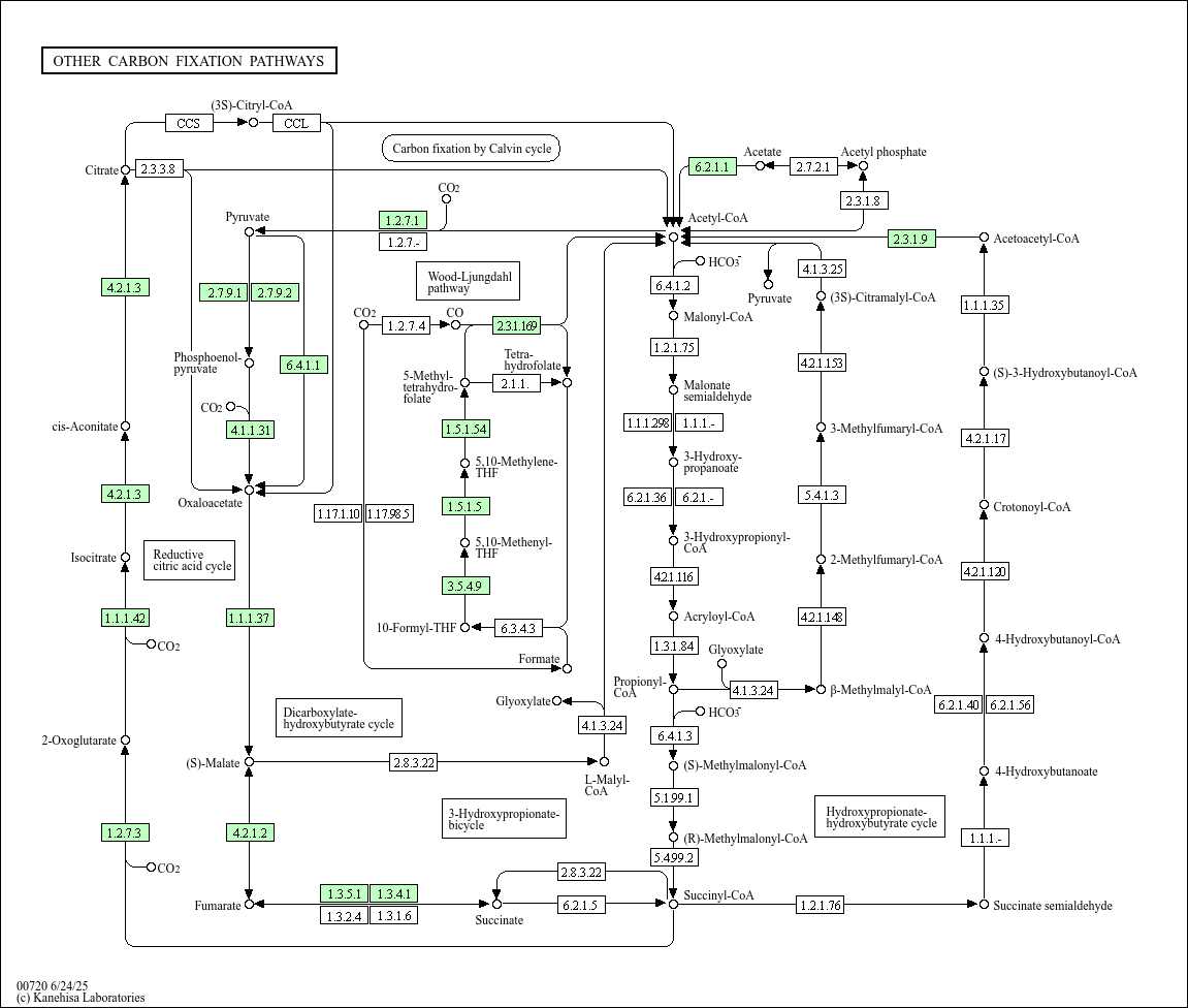 M00173] is found in microaerophiles and anaerobes, such as green sulfur bacteria. In one complete turn of this cycle, four molecules of CO2 are fixed by the enzymes that are sensitive to oxygen, resulting in the production of one molecule of oxaloacetate, which is itself an intermediate of the cycle. (ii) The reductive acetyl-CoA pathway (Wood-Ljungdahl pathway) [MD: