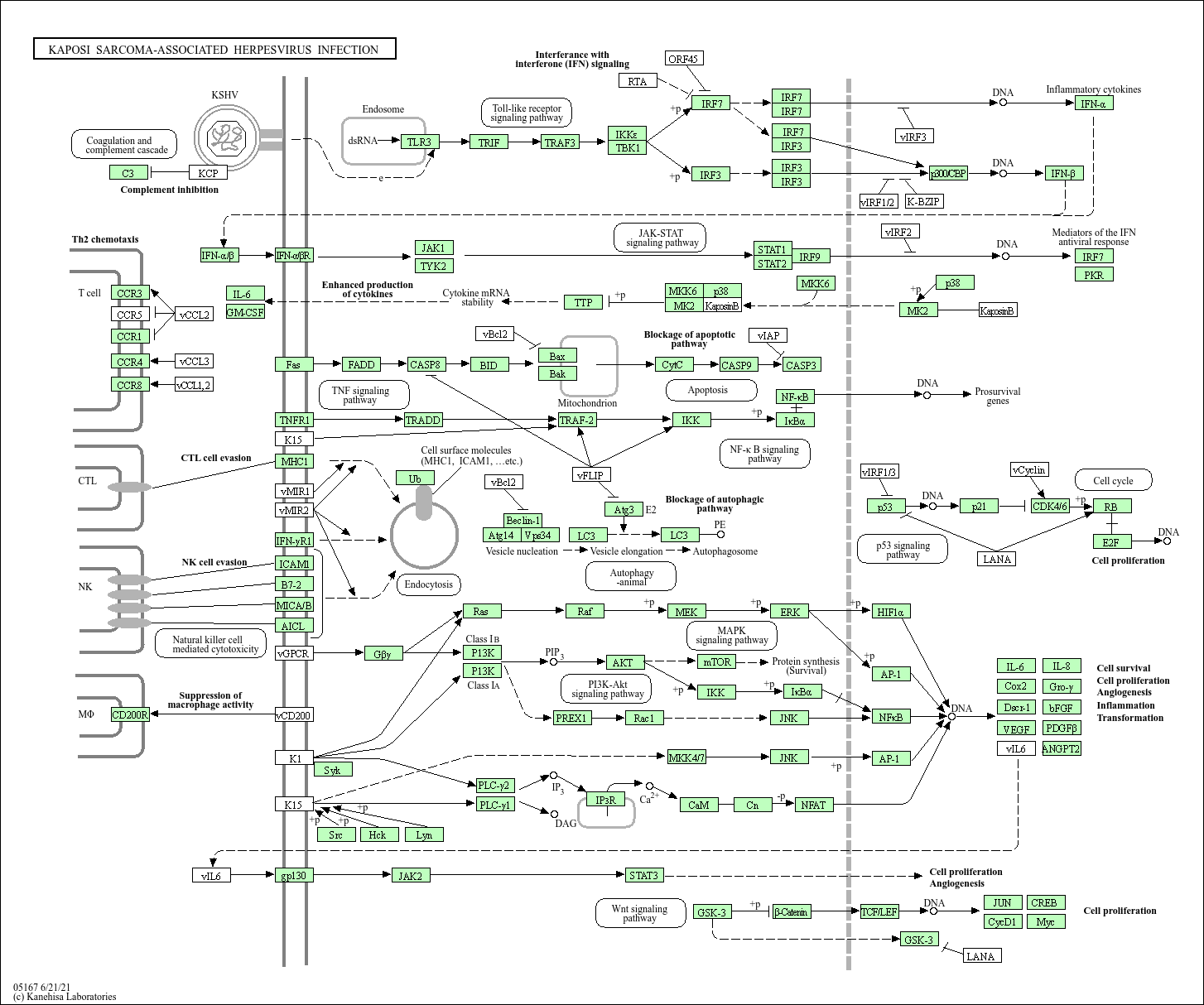 Kaposi sarcoma-associated herpesvirus (KSHV), also known as human herpesvirus 8 (HHV-8), is the most recently identified human tumor virus, and is associated with the pathogenesis of Kaposi's sarcoma (KS), primary effusion lymphoma (PEL), and Multicentric Castleman's disease (MCD). Like all other herpesviruses, KSHV displays two modes of life cycle, latency and lytic replication, which are characterized by the patterns of viral gene expression. Genes expressed in latency (LANA, v-cyclin, v-FLIP, Kaposins A, B and C and viral miRNAs) are mainly thought to facilitate the establishment of life long latency in its host and survival against the host innate, and adaptive immune surveillance mechanisms. Among the viral proteins shown to be expressed during lytic replication are potent signaling molecules such as vGPCR, vIL6, vIRFs, vCCLs, K1 and K15, which have been implicated experimentally in the angiogenic and inflammatory phenotype observed in KS lesions. Several of these latent viral and lytic proteins are known to transform host cells, linking KSHV with the development of severe human malignancies.