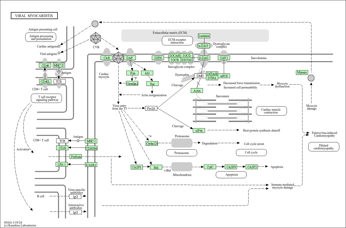 Myocarditis is a cardiac disease associated with inflammation and injury of the myocardium. It results from various etiologies, both noninfectious and infectious, but coxsackievirus B3 (CVB3) is still considered the dominant etiological agent. Myocarditis may be caused by direct cytopathic effects of virus, a pathologic immune response to persistent virus, or autoimmunity triggered by the viral infection. The virus enters the myocyte through internalization of the coxsackie-adenoviral receptor (CAR) and its coreceptor, decay-accelerating factor (DAF). Viral proteases cleave various proteins in the host cell. One example is viral protease 2A, which cleaves eukaryote initiation factor 4G (eIF4G) and the dystrophin protein, resulting in a complete shutdown of cap-dependent RNA translation and cytoskeletal destruction in infected cardiomyocytes, respectively. CVB3 also cleaves the member of the Bcl-2 family Bid, leading to apoptosis. CVB3 infection also induces the cleavage of cyclin D protein through a proteasome-dependent pathway, leading to the host cell-growth arrest. Viral infection and necrosis of myocytes may lead to the release of intracellular antigens, resulting in activation of self-reactive T cells. CVB infection is a significant cause of dilated cardiomyopathy (DCM) as well as myocarditis. Epidemiologically, myocarditis underlies a significant portion of patients with DCM.
