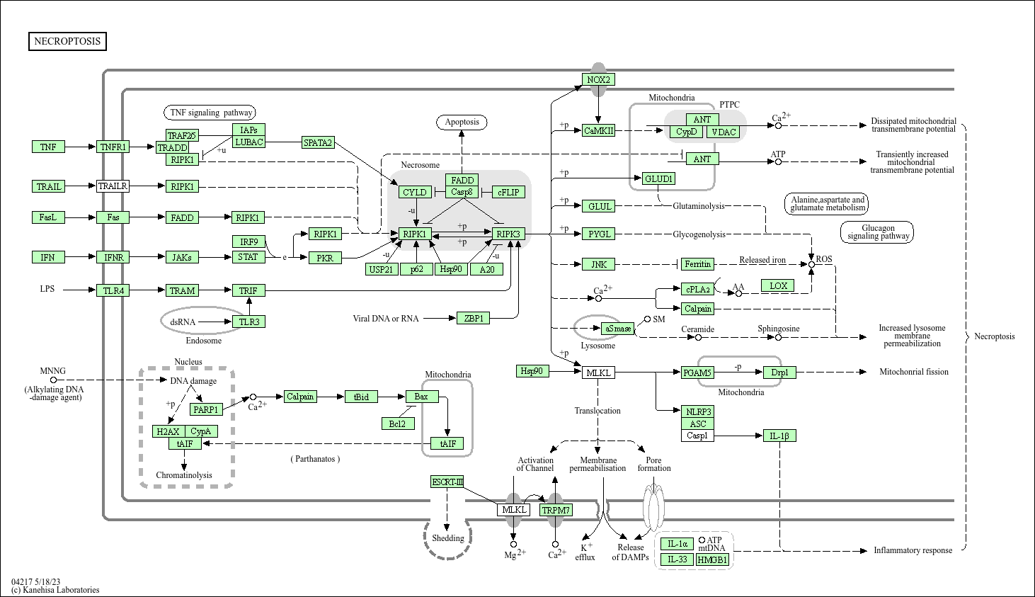 Necroptosis is a programmed form of necrosis. It can be initiated by different stimuli, such as tumor necrosis factor (TNF), TNF-related apoptosis-inducing ligand (TRAIL), Fas ligand (FasL), interferon (IFN), LPS, viral DNA or RNA, DNA-damage agent and requires the kinase activity of receptor-interacting protein 1 (RIPK1) and RIPK3. Its execution involves ROS generation, calcium overload, the opening of the mitochondrial permeability transition pore, mitochondrial fission, inflammatory response and chromatinolysis. Necroptosis participates in many pathogenesis of diseases, including neurological diseases, retinal disorders, acute kidney injury, inflammatory diseases and microbial infections.