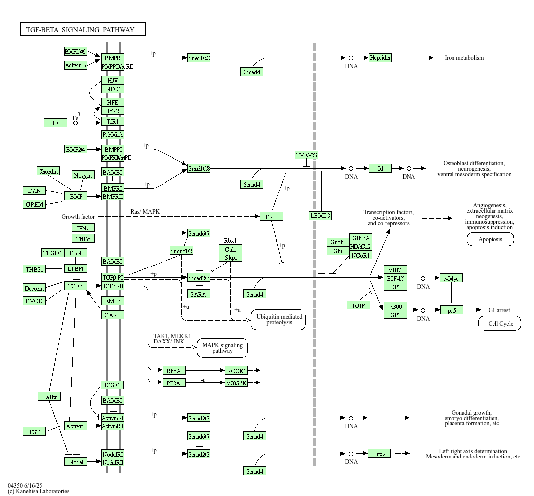The transforming growth factor-beta (TGF-beta) family members, which include TGF-betas, activins and bone morphogenetic proteins (BMPs), are structurally related secreted cytokines found in species ranging from worms and insects to mammals. A wide spectrum of cellular functions such as proliferation, apoptosis, differentiation and migration are regulated by TGF-beta family members. TGF-beta family member binds to the Type II receptor and recruits Type I, whereby Type II receptor phosphorylates and activates Type I. The Type I receptor, in turn, phosphorylates receptor-activated Smads ( R-Smads: Smad1, Smad2, Smad3, Smad5, and Smad8). Once phosphorylated, R-Smads associate with the co-mediator Smad, Smad4, and the heteromeric complex then translocates into the nucleus. In the nucleus, Smad complexes activate specific genes through cooperative interactions with other DNA-binding and coactivator (or co-repressor) proteins.